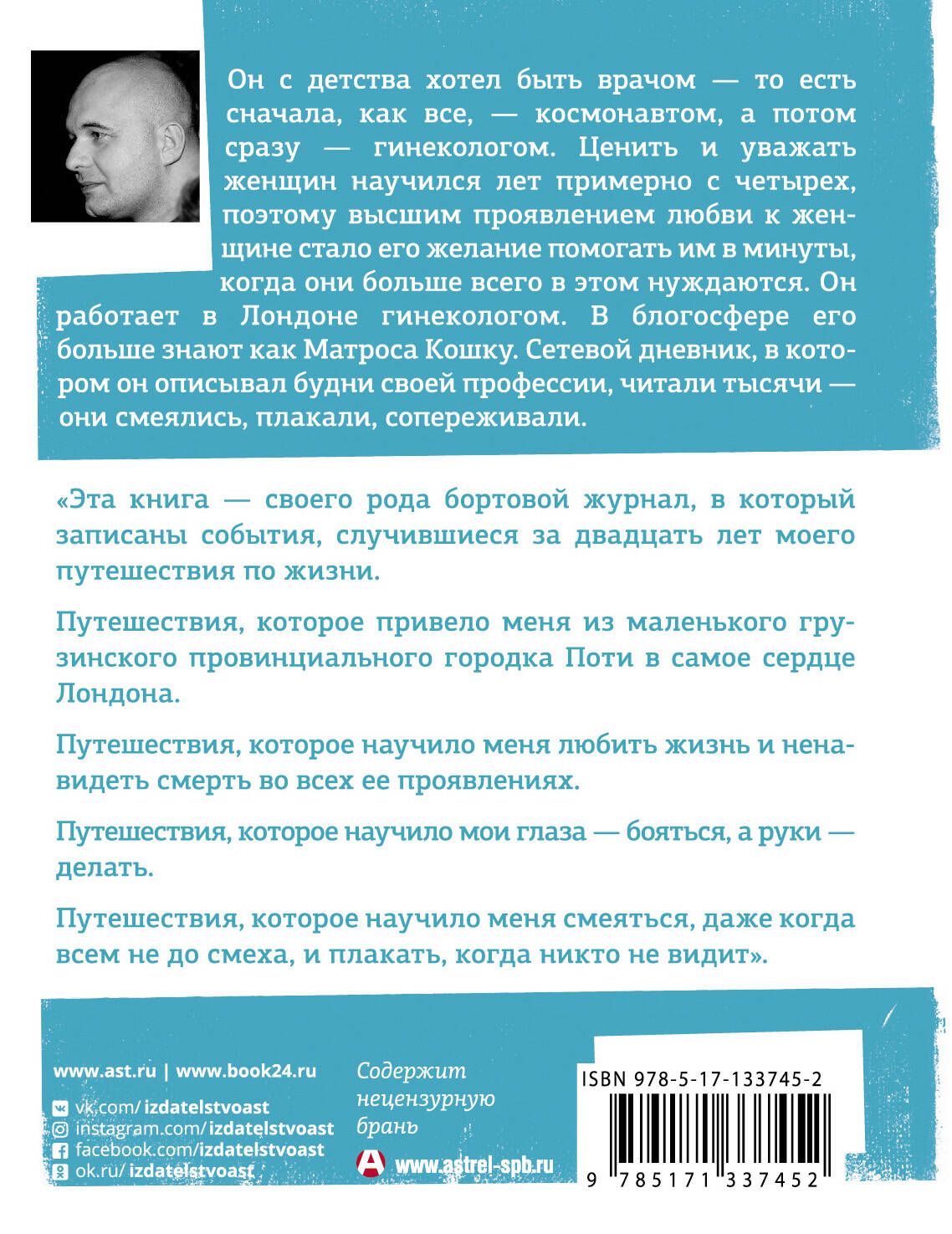 Байки легендарного Матроса Кошки (ник автора в ЖЖ) в долгожданном переиздании книги "Держите ножки крестиком"! Он с детства хотел быть врачом - то есть сначала, как все,- космонавтом, а потом сразу - гинекологом. Ценить и уважать женщин научился лет примерно с четырех, поэтому высшим проявлением любви к женщине стало его желание помогать им в минуты, когда они больше всего в этом нуждаются. Он работает в Лондоне гинекологом. В блогосфере его больше знают как Матроса Кошку. Сетевой дневник, в котором он описывал будни своей профессии, читали тысячи - они смеялись, плакали, сопереживали. "Эта книга - своего рода бортовой журнал, в который записаны события, случившиеся за двадцать лет моего путешествия по жизни. Путешествия, которое привело меня из маленького грузинского провинциального городка Поти в самое сердце Лондона. Путешествия, которое научило меня любить жизнь и ненавидеть смерть во всех ее проявлениях. Путешествия, которое научило мои глаза - бояться, а руки - делать. Путешествия, которое научило меня смеяться, даже когда всем не до смеха, и плакать, когда никто не видит". Денис Цепов| Издательство | ИЗДАТЕЛЬСТВО "АСТ" |