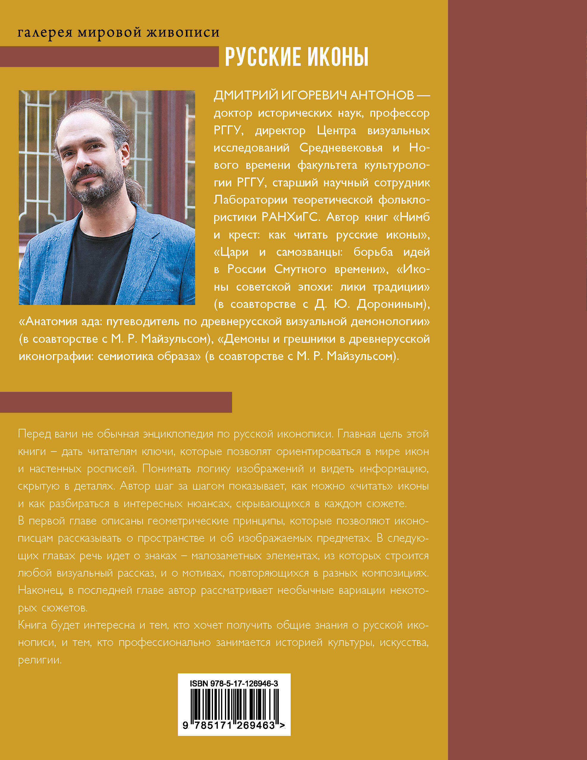 Не обычный путеводитель по русской иконописи. Главная цель книги доктора исторических наук, профессора РГГУ Дмитрия Игоревича Антонова - дать читателям ключи, которые позволят ориентироваться в мире икон и настенных росписей. Понимать логику изображений и видеть информацию, скрытую в деталях. Автор шаг за шагом показывает, как можно «читать» иконы и как разбираться в интересных нюансах, скрывающихся в каждом сюжете. В каждой главе, кроме общих сведений, речь идет о редких деталях и интересных фактах, связанных с русскими иконами.| Издательство | Издательство "АСТ" |