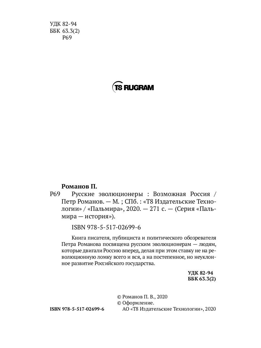 Книга писателя, публициста и политического обозревателя Петра Романова посвящена русским эволюционерам - людям, которые двигали Россию вперед, делая при этом ставку не на революционную ломку всего и вся, а на постепенное, но неуклонное развитие Российского государства.
