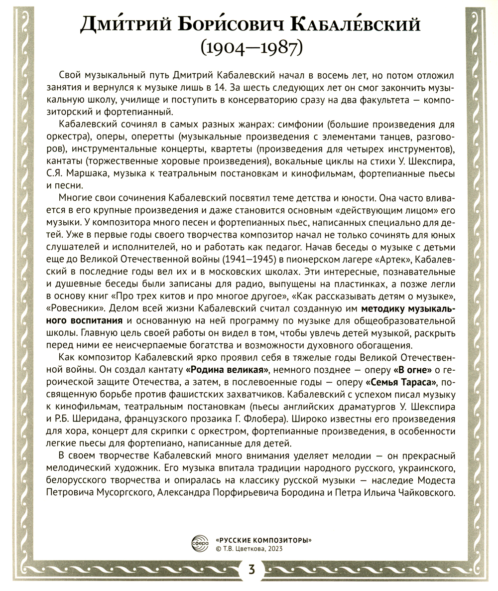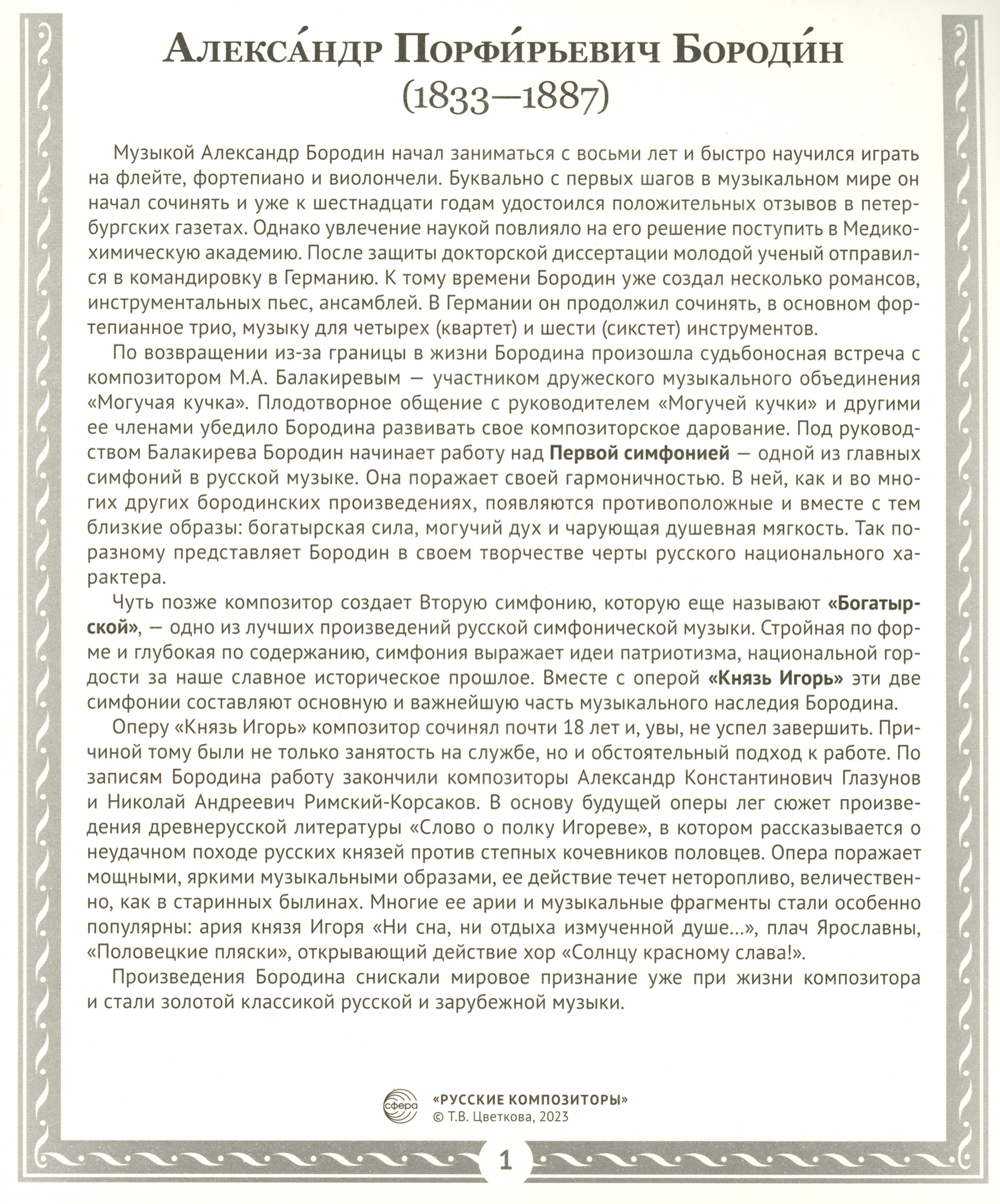 Комплект демонстрационных материалов «Русские композиторы» посвящен классикам русской музыки, с творчеством которых ребенок знакомится в детском саду и школе. Пособие содержит: - интересные биографические факты; - краткий обзор творчества композиторов; - рассказ о наиболее значимых музыкальных произведениях. Знания даются сжато, но в достаточном для ребенка объеме. Работа с материалами поможет детям расширить кругозор, познакомиться с русской музыкальной культурой, пополнить активный словарь, развить образную речь и зрительную память. Пособие призвано усилить впечатление от прослушанных на занятиях музыкальных произведений, вовлечь детей в прекрасный мир классической музыки. Портреты композиторов проиллюстрируют рассказ. Рекомендуем использовать их для постоянной или временной экспозиции в группе и классе. Пособие создано для занятий с детьми 6-11 лет, более старшие дети и взрослые могут самостоятельно познакомиться с материалами данного пособия. Подходит для индивидуальной и груповой работы.| Издательство | Творческий центр Сфера |