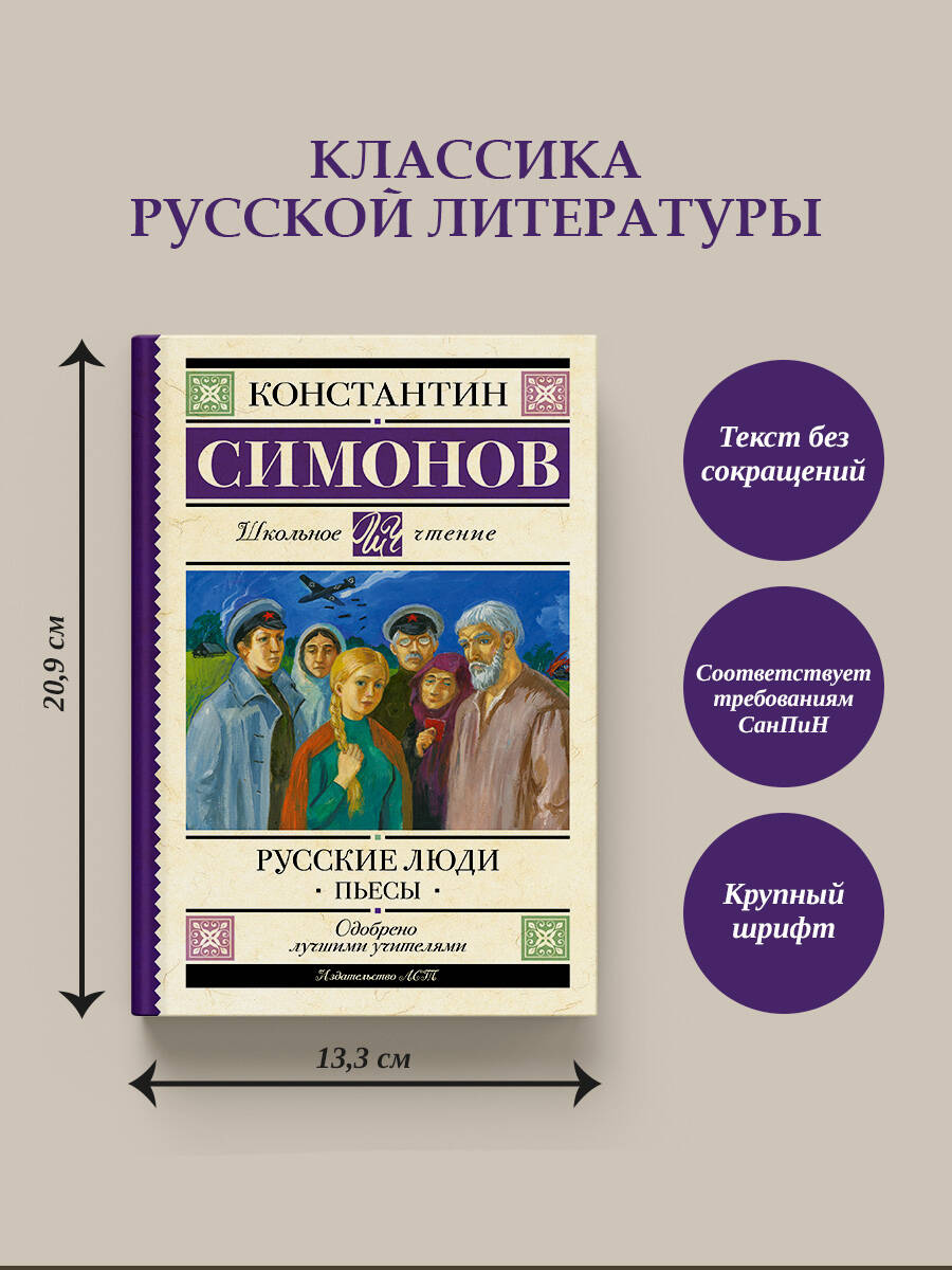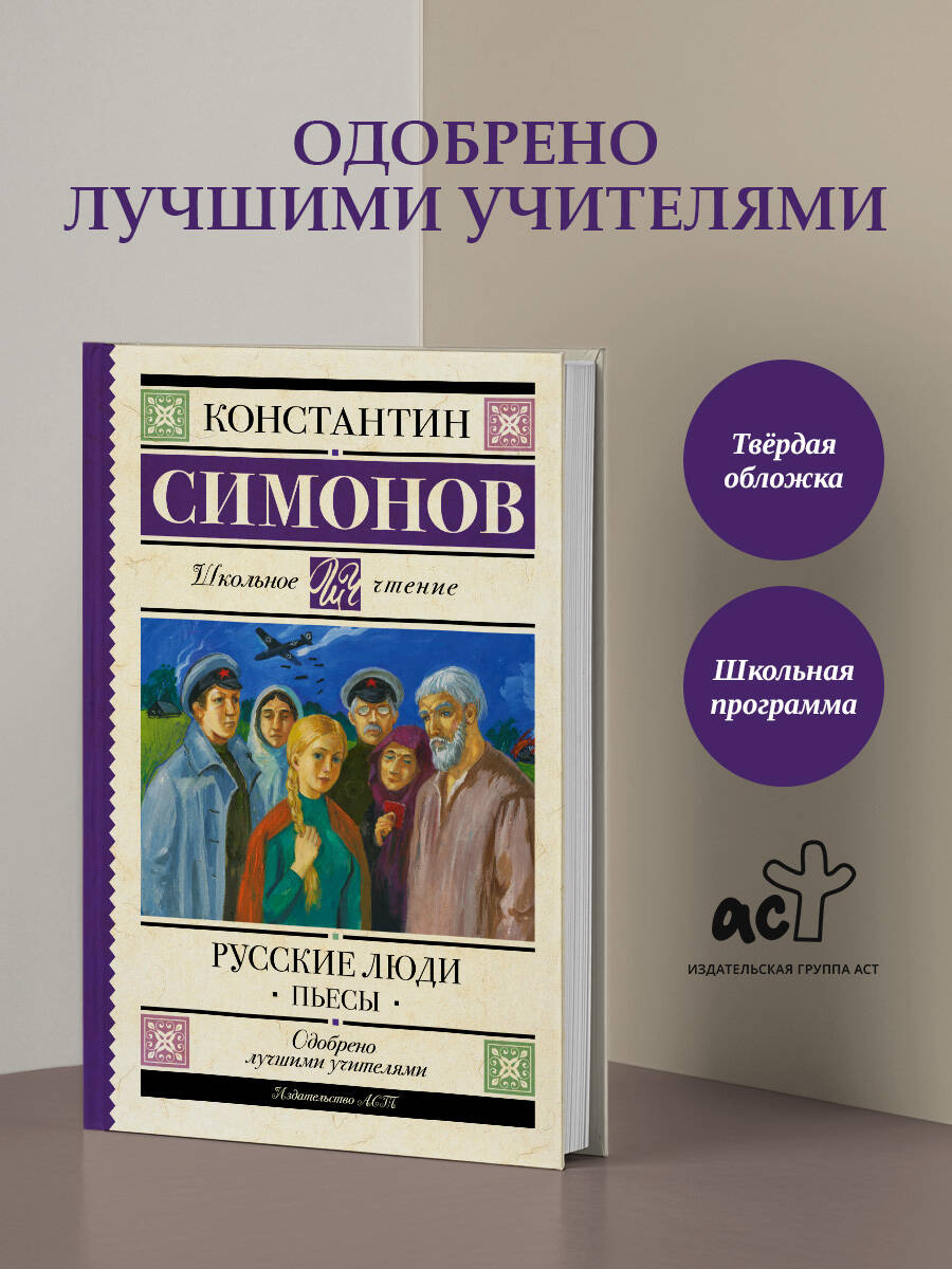 Пьеса "Русские люди" входит в программу углубленного чтения по литературе в 11-м классе. Константин Михайлович Симонов (1915-1979) - советский писатель, военный корреспондент, общественный деятель. "Ты слыхал или нет, писатель? Ты слыхал или нет, как русские люди на смерть уходят?" "Русские люди" (1942) - пьеса, написанная в разгар Великой Отечественной войны, и сыгравшая огромную роль в поднятии боевого духа советских солдат и тружеников тыла. В центре пьесы - обычные "русские люди": солдаты и партизаны, чьи мужество и преданность Родине проявляются в нечеловеческих условиях войны. В книгу также вошла пьеса К. Симонова "История одной любви" (1951).| Издательство | Издательство "АСТ" |