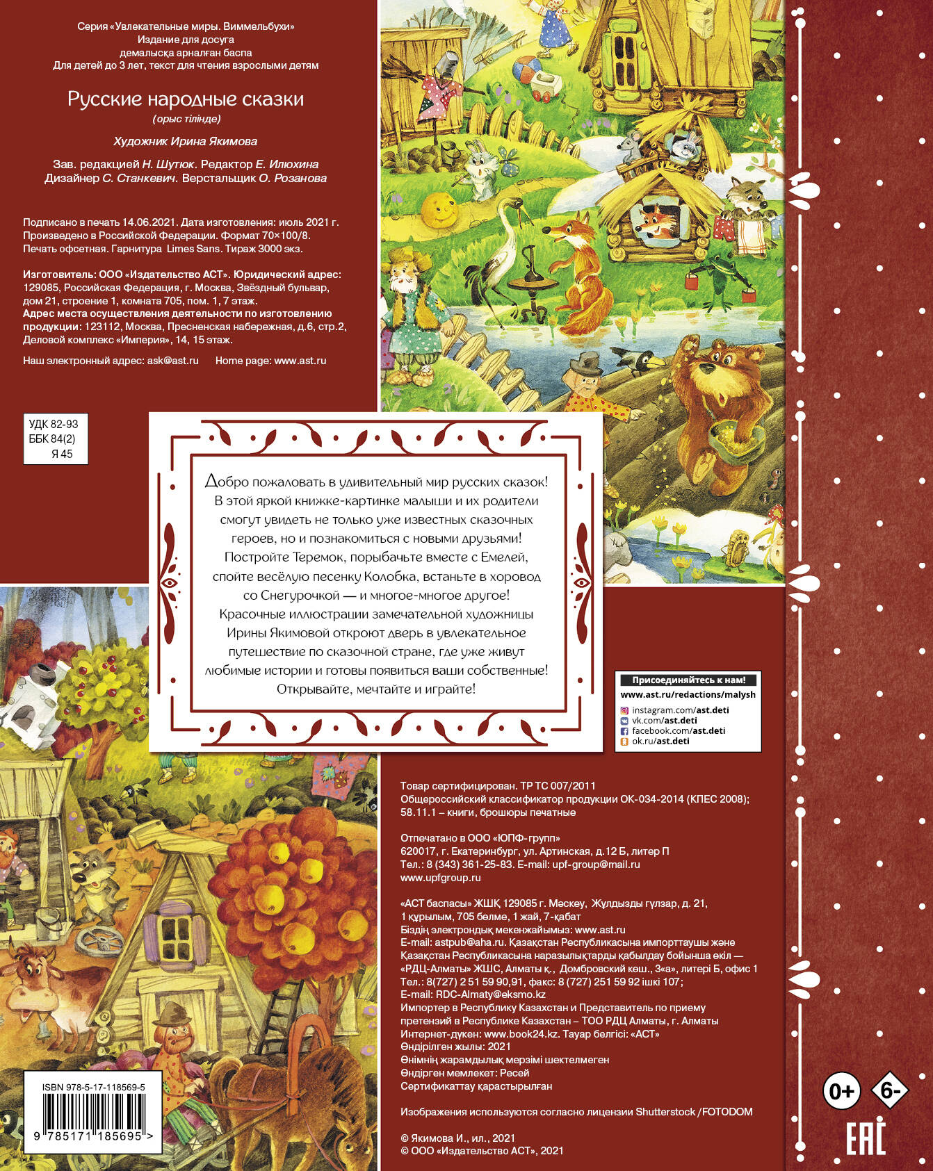 Добро пожаловать в удивительный мир русских сказок! В этой яркой книжке-картинке малыши и их родители смогут увидеть не только уже известных сказочных героев, но и познакомиться с новыми друзьями! Постройте Теремок, порыбачьте вместе с Емелей, спойте весёлую песенку Колобка, встаньте в хоровод со Снегурочкой - и многое-многое другое! Красочные иллюстрации замечательной художницы Ирины Якимовой откроют дверь в увлекательное путешествие по сказочной стране, где уже живут любимые истории и готовы появиться ваши собственные! Открывайте, мечтайте и играйте!| Издательство | ИЗДАТЕЛЬСТВО "АСТ" |