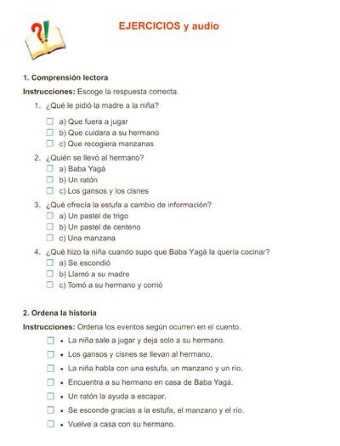 Русские народные сказки для изучающих испанский язык. Учебные материалы. Уровень А2-В1 (Гуси-Лебеди, Маша и медведь, Каша из топора)(кн.на испан.яз.)