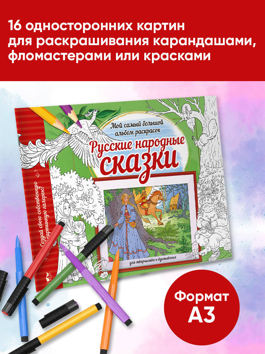 Создайте свою собственную картинную галерею! На каждой странице вас ждут знакомые герои, таинственные леса и расписные терема, готовые ожить под вашим карандашом, фломастером или кистью. Раскрасьте храброго Ивана-царевича и мудрую Василису Прекрасную, встретьте Жар-птицу в саду с молодильными яблоками, распишите узорами сказочные избушки и дремучие чащи. Погрузитесь в атмосферу старинных преданий, где добро побеждает зло, а волшебство скрывается в каждом штрихе. Этот альбом на плотной бумаге - идеальный спутник для любителей фольклора и творчества. Сотворите свою неповторимую сказку!| Издательство | Издательство "АСТ" |
