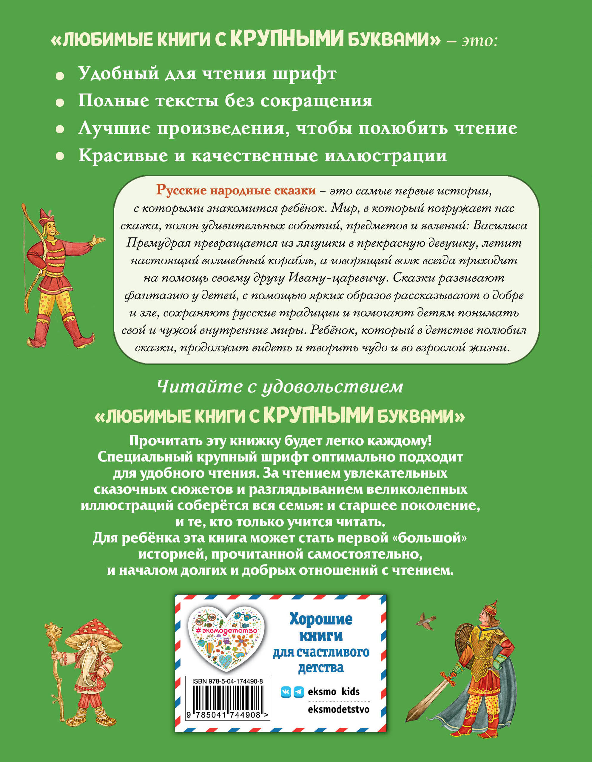 О ЧЁМ КНИГА В книгу вошло 11 русских народных сказок: «Поди туда - не знаю куда, принеси то - не знаю что», «Царевна-лягушка», «Летучий корабль», «По щучьему велению» и другие. С помощью простых историй, которые создал русский народ, дети начинают своё знакомство с миром: на ярких образах учатся различать добро и зло, развивают фантазию, узнают много нового о русском фольклоре, традициях и языке. Сказки проверены многими поколениями читателей, которые на них выросли и сохранили добрую память о них и во взрослой жизни. ОСОБЕННОСТИ КНИГИ • Крупный и удобный шрифт для чтения. • Идеально подходит для первого самостоятельного чтения. • Отличный вариант для первого знакомства ребёнка с русскими народными сказками. • Яркие цветные иллюстрации современного российского художника Максима Митрофанова. О СЕРИИ «Любимые книги с крупными буквами» - это полные тексты классических произведений детской литературы, крупный и удобный для чтения шрифт, позволяющий ребёнку читать книгу как со взрослыми, так и самостоятельно.| Издательство | ООО "Издательство "Эксмо" |