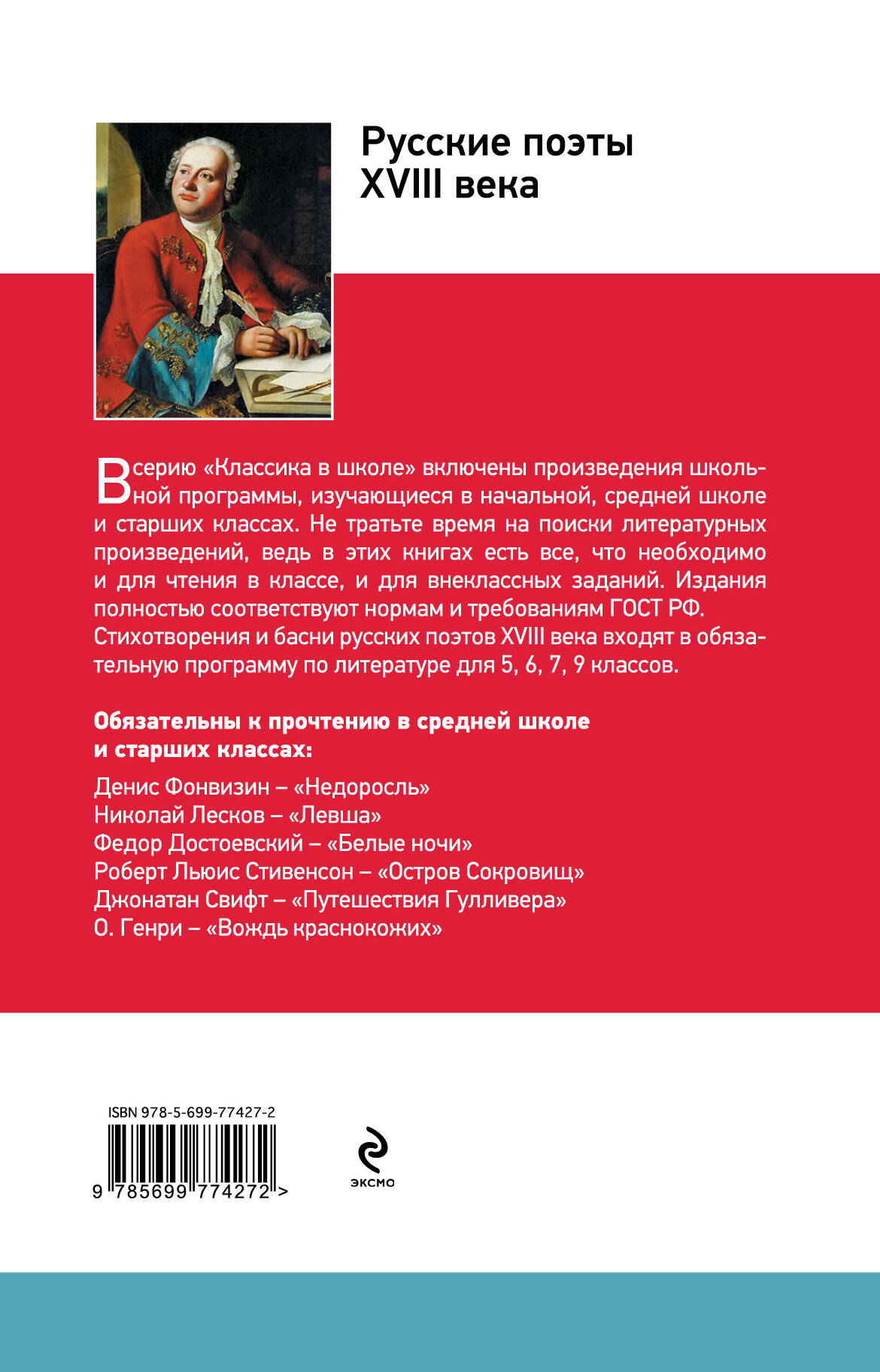 Перед вами книга из серии "Классика в школе", в которой собраны все произведения, изучающиеся в начальной школе, средних и старших классах. Не тратьте время на поиски литературных произведений, ведь в этих книгах есть все, что необходимо прочесть по школьной программе: и для чтения в классе, и для внеклассных заданий. Избавьте своего ребенка от длительных поисков и невыполненных уроков. В книгу включены стихотворения и басни поэтов XVIII века: М. В. Ломоносова, Г. Р. Державина, А. П. Сумарокова, М.М. Хераскова, Д.И. Фонвизина, А.Н. Радищева, Н.М. Карамзина, И.И. Дмитриева и многих других.| Издательство | ООО "Издательство "Эксмо" |