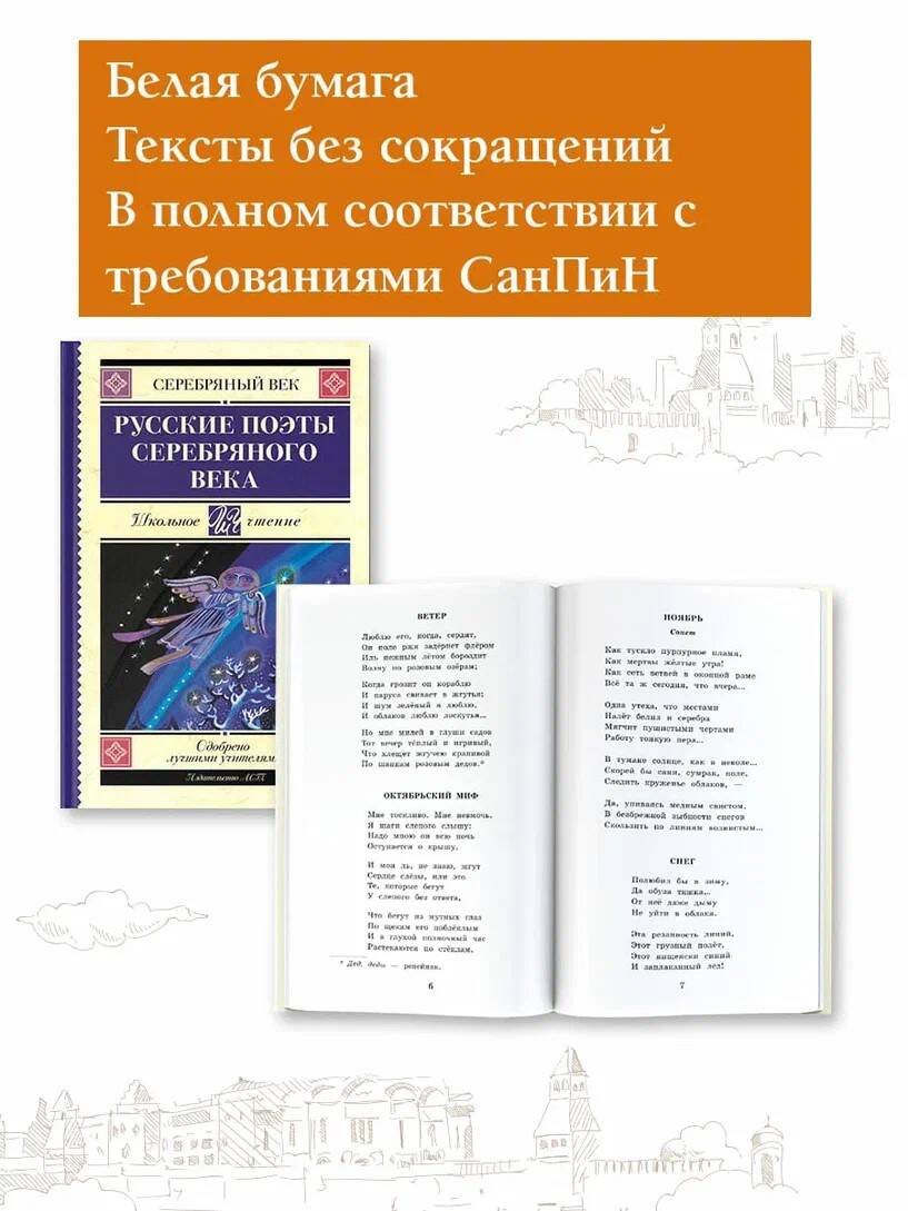 Серебряный век - образное название в истории русской поэзии конца XIX - начала ХХ века. Это была "одна из самых утончённых эпох в истории русской культуры, эпоха творческого подъёма и философии". Так писал русский философ Н.А. Бердяев, который и дал название этому периоду культуры и искусства. Первые десятилетия ХХ века - сложная и страшная страница в истории России - эпоха войн и революций. "Русскими душами овладели предчувствия надвигающихся катастроф. Поэты видели не только зори, но и что-то страшное, надвигающееся на Россию и мир…" Поэзия серебряного века вобрала в себя античную мифологию, библейскую историю, богатый опыт европейской и мировой литературы; теснейшим образом связана с русским фольклором, его песнями, плачами, сказаниями и частушками. В книгу вошли стихотворения и поэмы русских поэтов Серебряного века разных поэтических направлений и течений: И. Анненского, К. Фофанова, Д. Мережковского, К. Бальмонта, В. Брюсова, А. Блока, А. Ахматовой, О. Мандельштама, М. Цветаевой и др.| Издательство | Издательство "АСТ" |