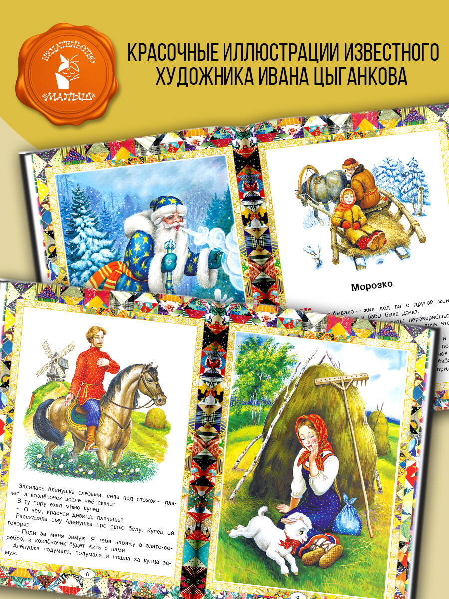 В книгу вошли волшебные сказки: "Царевна-лягушка", "Кощей Бессмертный", "Баба-яга", "Волшебное кольцо", "Василиса Прекрасная" и многие другие. Они полны чудесных превращений и удивительных приключений. Что ни сказка, то чудеса одно другого интереснее: вот всесильный Морозко одарил вроде бы ни за что крестьянскую девушку бесценными подарками, а колдун превратил прекрасную царевну в лягушку... Вот маленькая куколка спасает девочку Василисушку ото всех бед, а волшебное полотенце и гребешок становятся непреодолимыми преградами для бабы-яги в её погоне за другой девочкой... Иллюстрации художника И. Цыганкова. Для младшего школьного возраста.