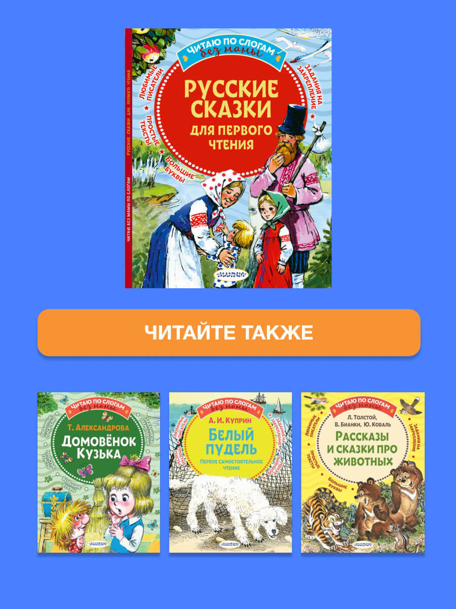 5 причин купить книгу: 1. Простой текст, где все слова с ударениями и разбиты на слоги. 2. Сказки входят в золотой фонд русской народной литературы, развивают чувство родного языка. 3. Истории учат малышей честности, доброте и справедливости. 4. Комплекс упражнений для улучшения техники чтения. 5. Физкультминутки с пальчиковой гимнастикой для активизации работы мозга.| Издательство | АСТ |