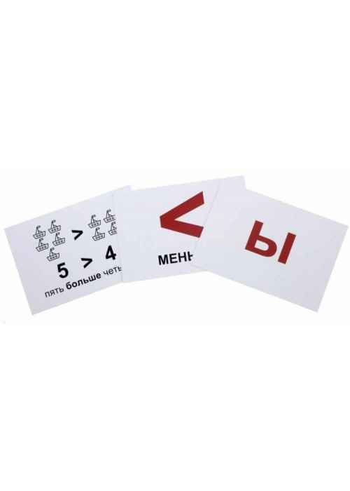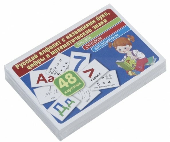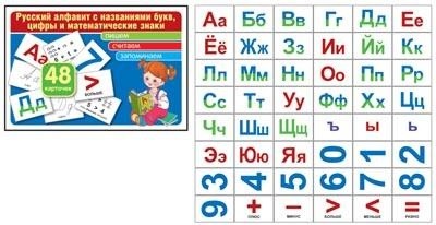 Аннотация: Русский алфавит с названиями букв, цифры и математические знаки (комплект карточек, 48 штук)