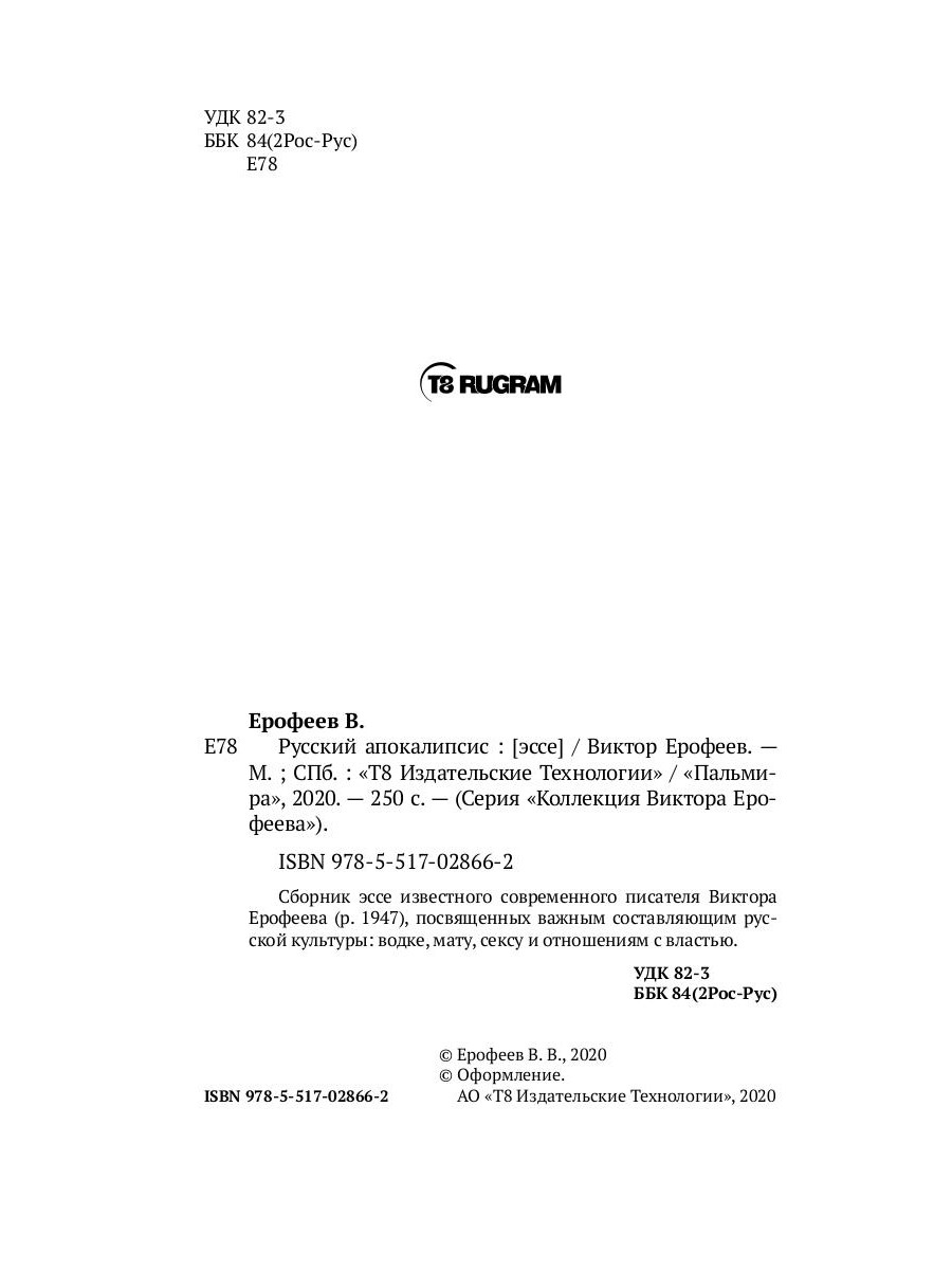 Сборник эссе известного современного писателя Виктора Ерофеева (р. 1947), посвященных важным составляющим русской культуры: водке, мату, сексу и отношениям с властью.