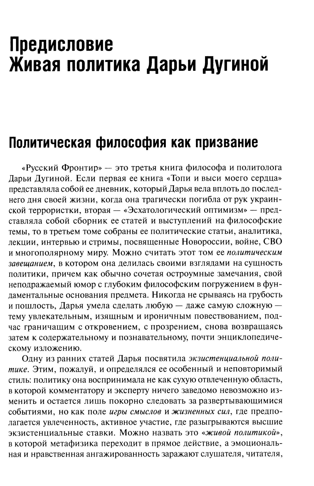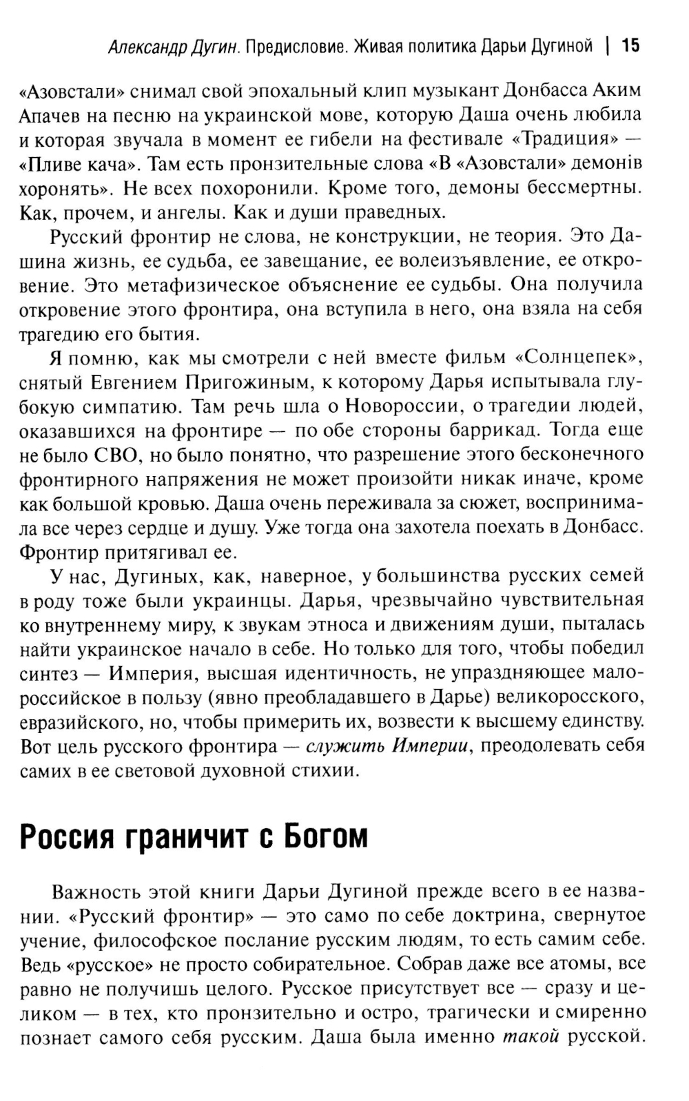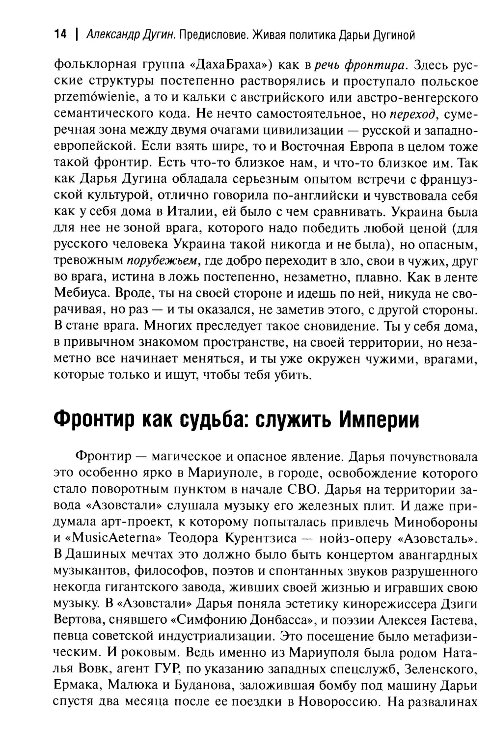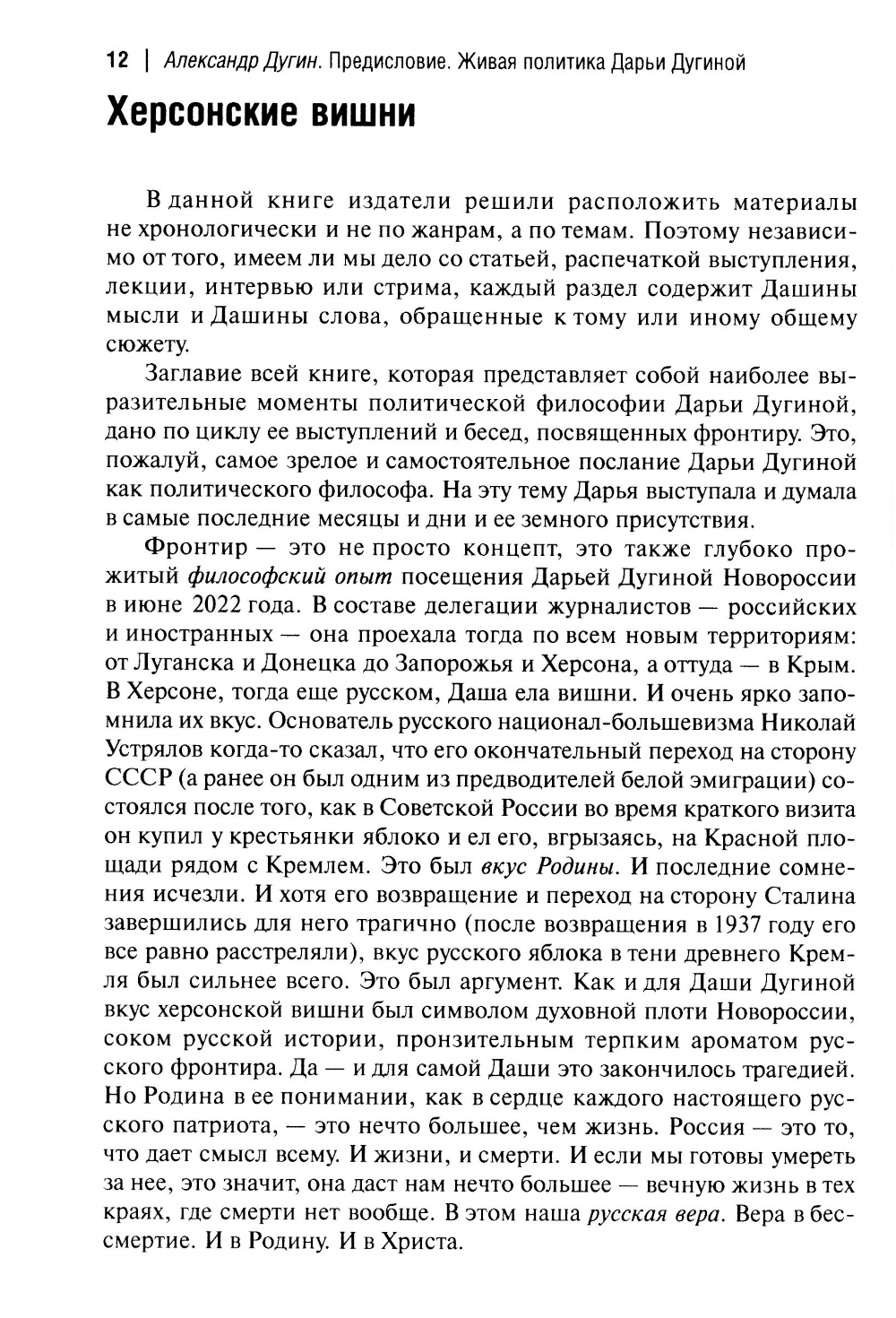 Новая книга Дарьи Дугиной состоит из эссе, текстов выступлений, лекций, стримов и интервью, посвященных широкому спектру философских, геополитических и культурологических проблем. В книге рассматриваются вопросы философии границ, метафизики фронтира, теории духовных и физических войн и международной политики европейских, азиатских и африканских стран. В своем оригинальном и легко узнаваемом стиле автор открывает глубинные измерения мировой политики, столкновения цивилизаций, геополитических конфронтаций. Для широкого круга читателей, интересующихся современной философией и политологией.| Издательство | Академический проект |