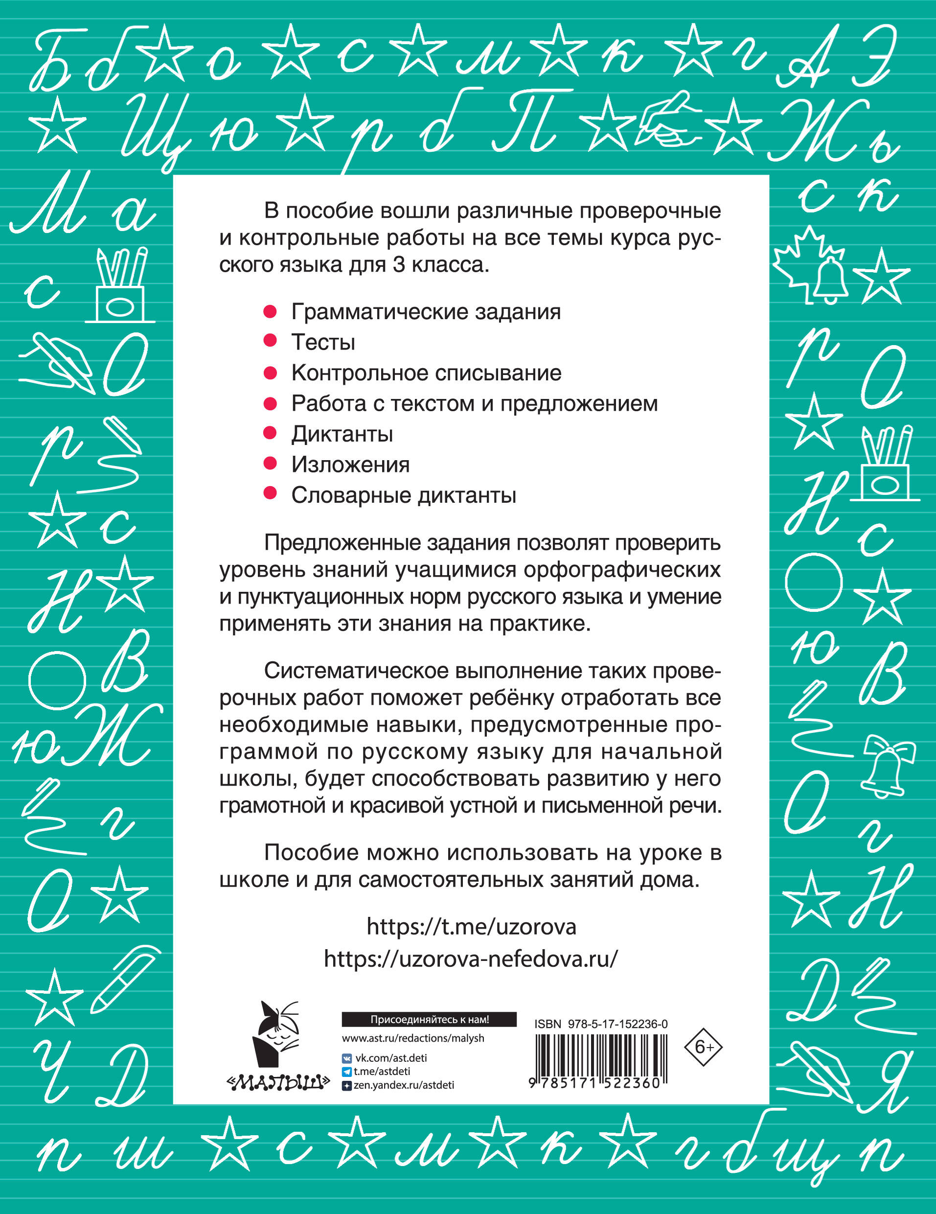 Задания пособия позволят проверить уровень знаний учащимися орфографических и пунктуационных норм русского языка и умение применять эти знания на практике. Систематическое выполнение заданий пособия помогут ребёнку отработать все необходимые навыки, предусмотренные программой по русскому языку для начальной школы, будет способствовать развитию у него грамотной и красивой устной и письменной речи, подготовит его к выполнению проверочных и контрольных работ любого уровня сложности. 5 причин 1. Пособие известных авторов О.В. Узоровой и Е.А. Нефёдовой поможет ребёнку в освоении школьной программы. 2. В одной книге собраны различные проверочные и контрольные работы на все темы курса русского языка для 3 класса. 3. Ребёнок сможет заниматься самостоятельно. 4. Выполняя работы, ребёнок повторит орфографические и пунктуационные нормы русского языка, закрепит полученные навыки. 5. Ребёнок отлично подготовится к проверочным и контрольным работам любого уровня сложности. О. В. Узорова и Е.А Нефёдова - известные педагоги-практики, авторы самых издаваемых учебников и учебных пособий в России. Основанные на авторской методике, доказавшей свою эффективность миллионными тиражами, эти пособия помогут родителям подготовить ребенка к школе, а ученикам - легко и эффективно освоить программу начальной школы. Все, что поможет ребенку стать успешным в учёбе, вы найдёте в книгах Узоровой и Нефёдовой: развитие речи, тексты для 3 класса, контрольное списывание, диктанты по русскому языку, подготовка к диктантам, задания по русскому языку, тесты по русскому языку, контрольная работа, самостоятельная работа, проверочные работы, справочное пособие, рабочая тетрадь, комплект рабочих тетрадей, тренинг, разные виды сложности, сборники заданий, комплексные работы, 3 класс, дети.| Издательство | ИЗДАТЕЛЬСТВО "АСТ" |