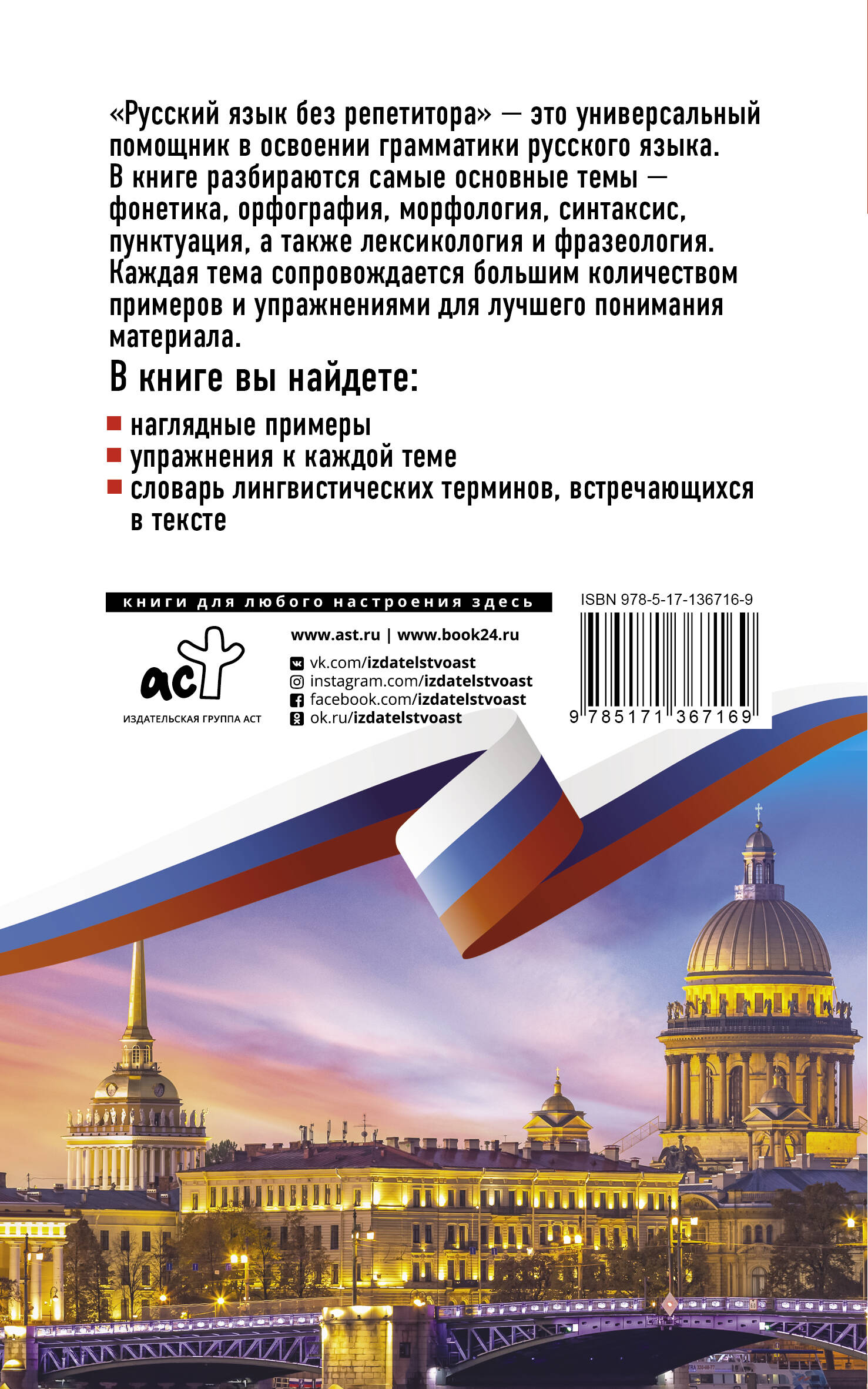 Данное издание отлично подойдет тем, кто хочет вспомнить все правила русского языка и закрепить свои знания. "Русский язык без репетитора" - это универсальный справочник по грамматике русского языка, охватывающий такие разделы, как фонетика, орфография, морфология, синтаксис, пунктуация, а также лексикология и фразеология. Правила проиллюстрированы большим количеством примеров. Даны многочисленные упражнения для закрепления пройденного. Книга идеально подходит для: - повторения правил русского языка, - подготовки к различным тестам и экзаменам. Пособие адресовано всем, кто хочет улучшить свою грамотность.| Издательство | Издательство "АСТ" |