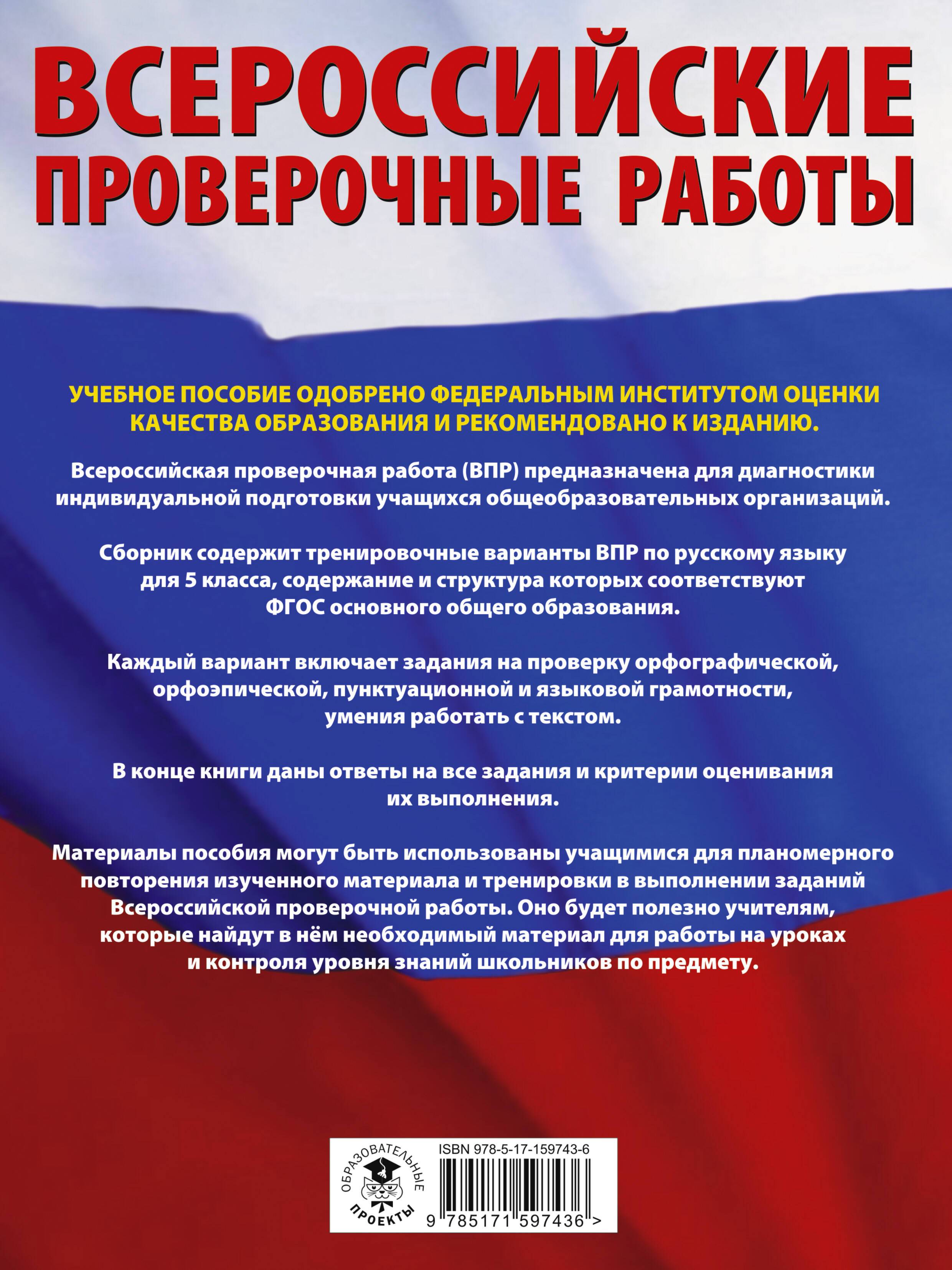 Пособие предназначено для подготовки учащихся 5 классов общеобразовательных организаций к Всероссийской проверочной работе (ВПР) по русскому языку. Сборник содержит 15 тренировочных вариантов ВПР, позволяющих оценить индивидуальные достижения школьников по предмету. Каждый вариант включает задания на проверку орфографической, орфоэпической, пунктуационной и языковой грамотности , умения работать с текстом. В конце книги даны ответы на все задания и критерии оценивания их выполнения. Материалы пособия могут быть использованы учащимися для планомерного повторения изученного материала и тренировки в выполнении заданий Всероссийской проверочной работы. Оно будет полезно учителям, которые найдут в нём необходимый материал для работы на уроках и контроля уровня знаний школьников по предмету.| Издательство | Издательство "АСТ" |