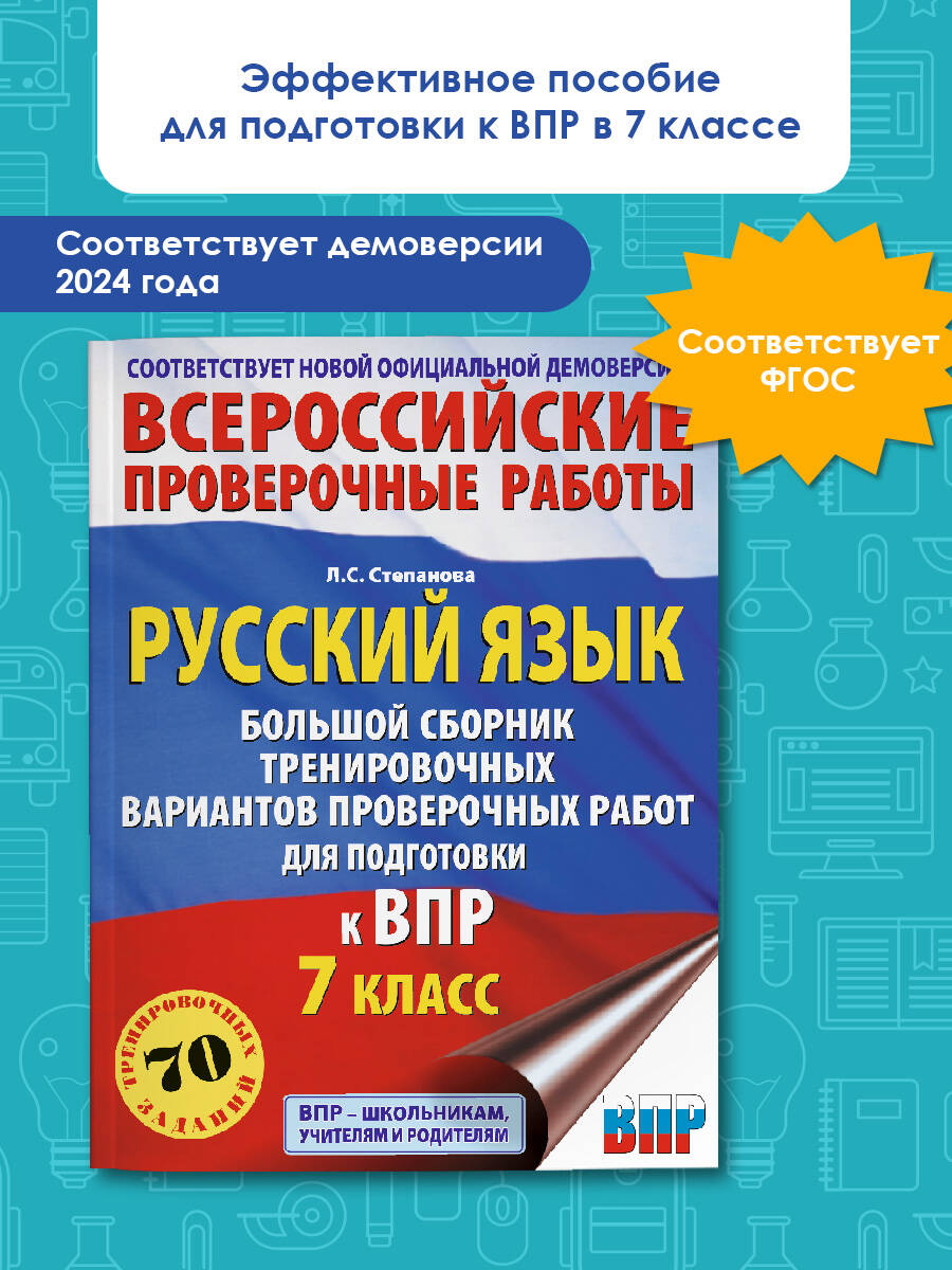 Пособие предназначено для подготовки учащихся 7 классов общеобразовательных организаций к Всероссийской проверочной работе. Сборник включает 10 тренировочных вариантов работ, которые по своему содержанию соответствуют Федеральному государственному образовательному стандарту основного общего образования. Каждый вариант содержит задания на проверку орфографической, орфоэпической, пунктуационной и языковой грамотности, умения работать с текстом. В конце книги даны ответы на все задания. Пособие может быть использовано как для самостоятельных занятий семиклассников, так и для аудиторной работы под руководством педагога.