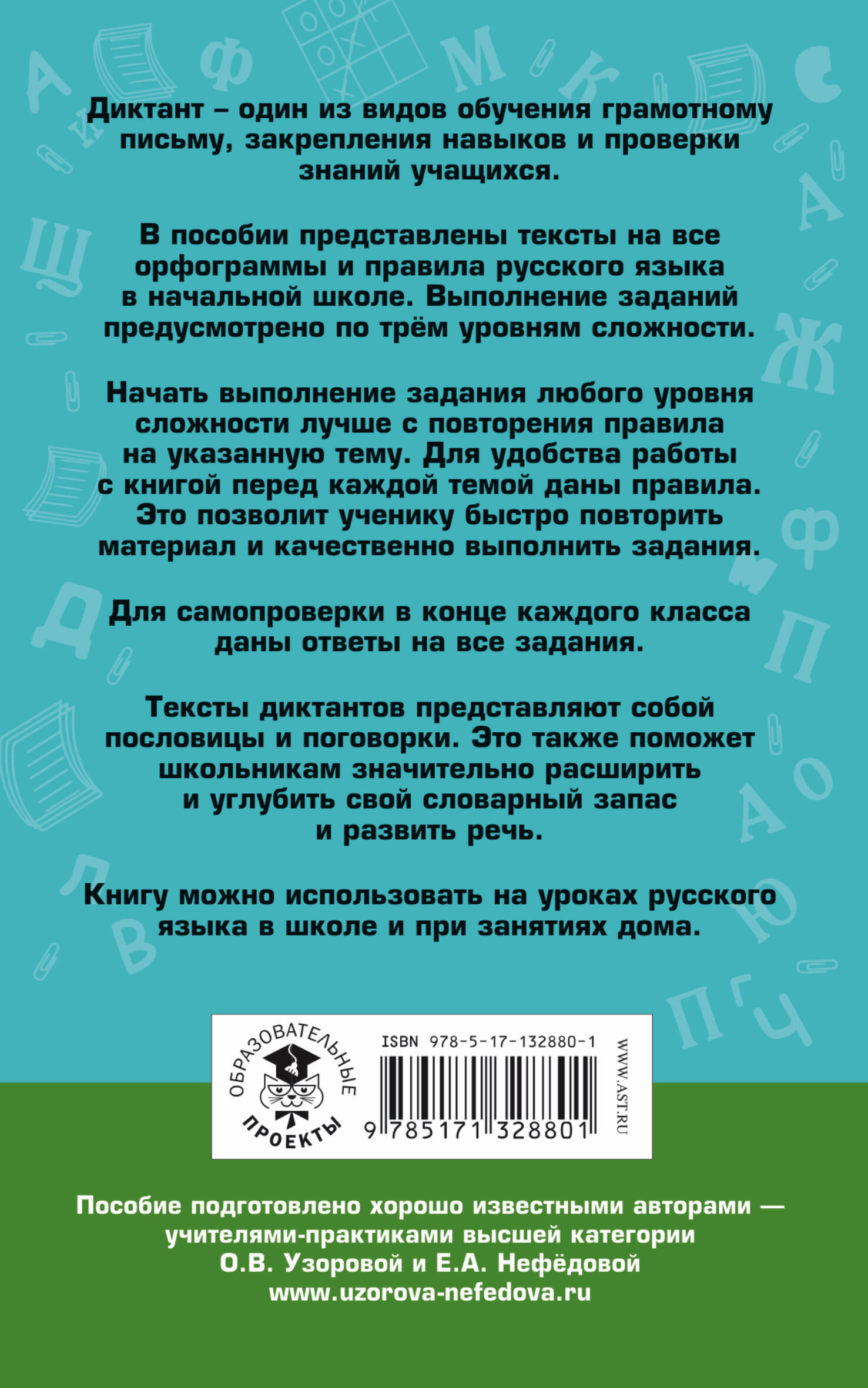 В пособии представлены тексты на все орфограммы и правила русского языка в начальной школе. Выполнение заданий предусмотрено по трём уровням сложности. Начать выполнение задания любого уровня сложности лучше с повторения правила на указанную тему. Для удобства работы с книгой, перед каждой темой даны правила. Это позволит ученику быстро повторить материал и качественно выполнить задания. Для самопроверки в конце каждого класса даны ответы на все задания. Тексты диктантов представляют собой пословицы и поговорки. Это также поможет школьникам значительно расширить и углубить свой словарный запас и развить речь. Книгу можно использовать на уроках русского языка в школе и при занятиях дома.| Издательство | Издательство "АСТ" |