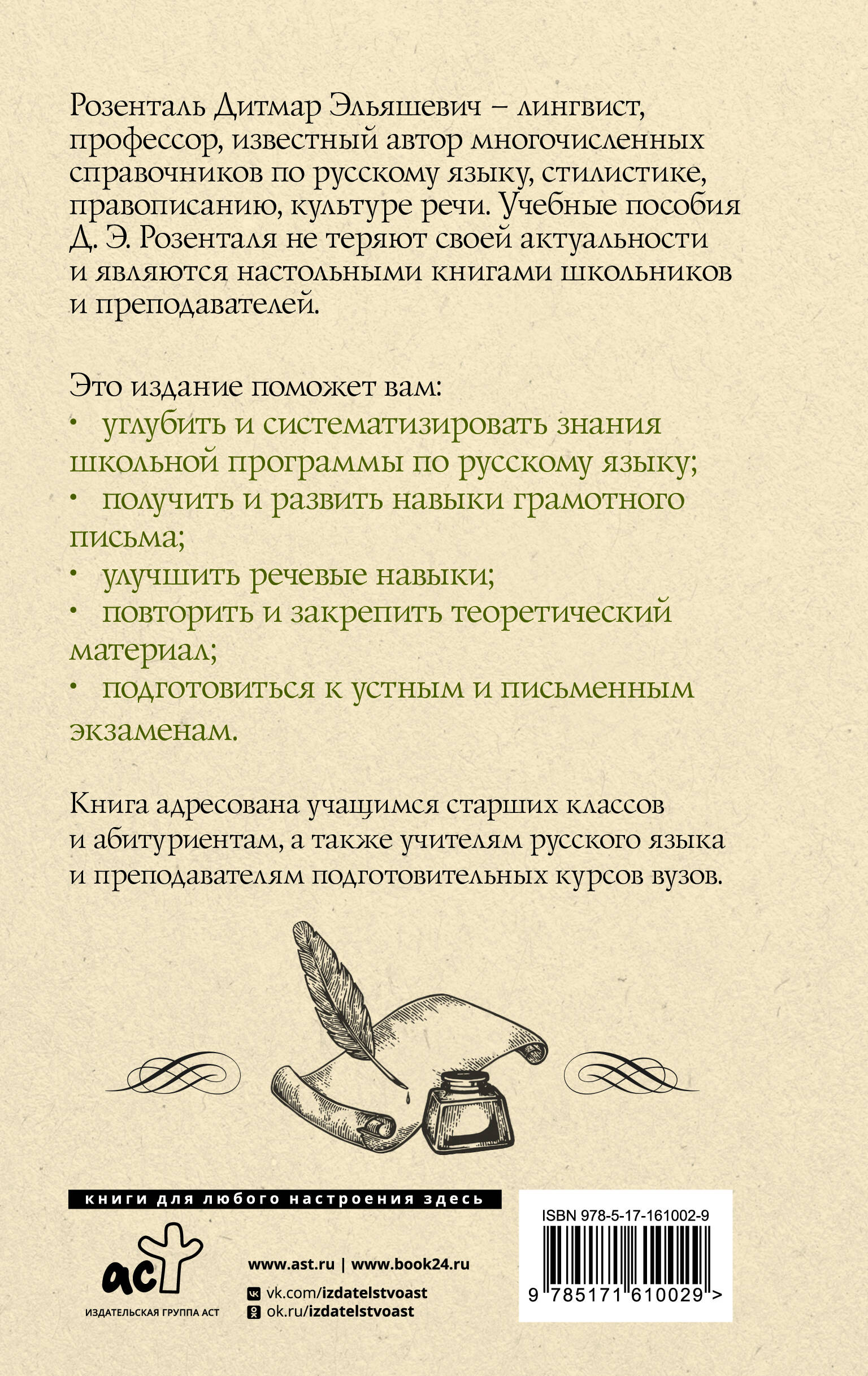 Розенталь Дитмар Эльяшевич - лингвист, профессор, известный автор многочисленных справочников по русскому языку, стилистике, правописанию, культуре речи. Учебные пособия и справочники Д. Э. Розенталя не теряют своей актуальности и являются настольными книгами школьников и преподавателей. Издание содержит теоретические сведения по орфографии и морфологии, синтаксису и пунктуации, а также более 200 тренировочных упражнений. Благодаря работе с этим пособием учащиеся смогут не только повторить школьную программу, но и подготовиться к выпускным и вступительным экзаменам по русскому языку, особенно к ОГЭ и ЕГЭ. Книга адресована учащимся старших классов и абитуриентам, а также учителям русского языка и преподавателям подготовительных курсов вузов.| Издательство | Издательство "АСТ" |