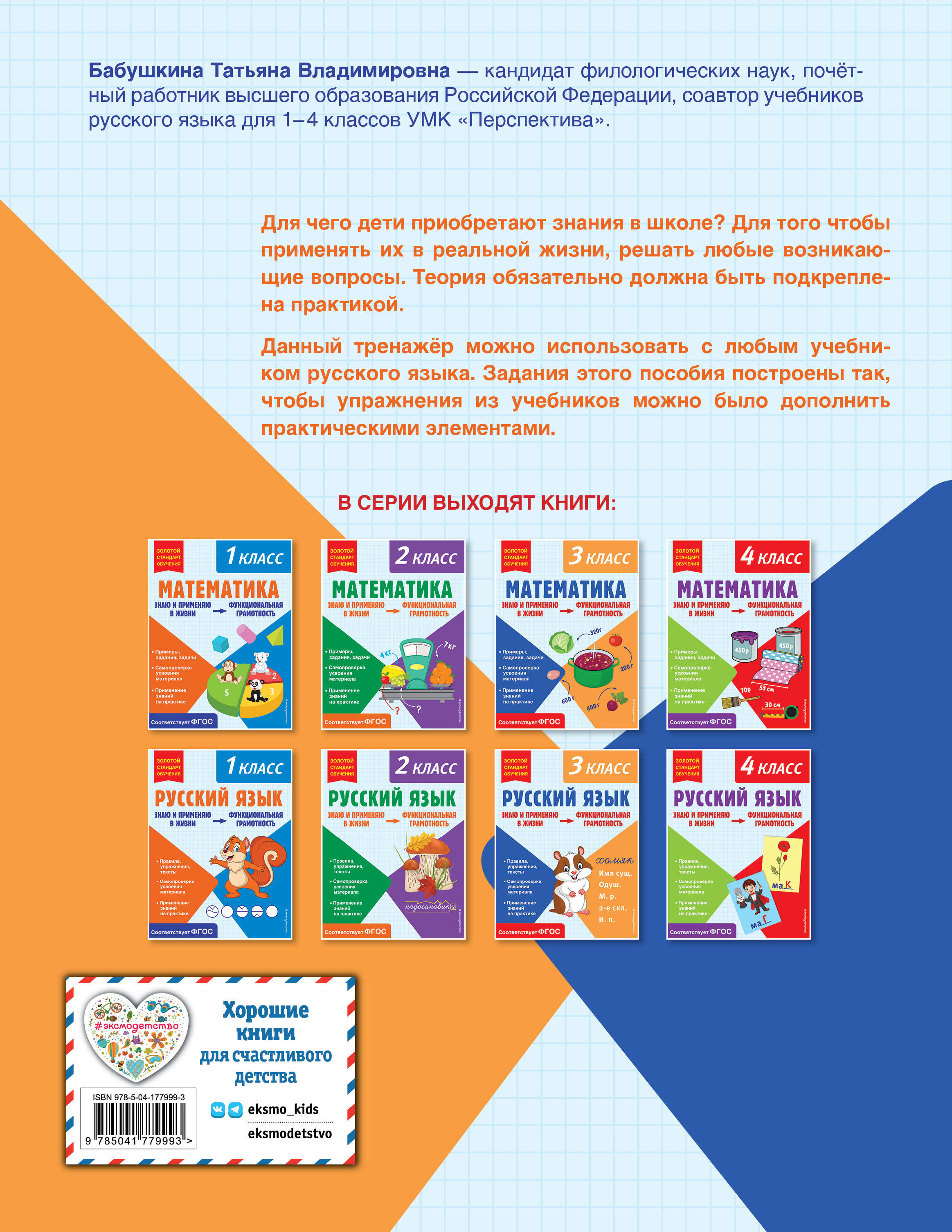 Тренажёр создан с целью научить третьеклассника применять на практике полученные знания. Каждая тема содержит задания как на самостоятельную проверку знаний, так и на их применение для решения самых разных практических задач. Выполнение заданий будет способствовать развитию не только языковой и речевой грамотности школьника, но и его функциональной грамотности. В результате занятий с тренажёром третьеклассник: • самостоятельно выяснит уровень своих знаний; • получит практический опыт их применения; • повысит мотивацию к учёбе.| Издательство | ООО "Издательство "Эксмо" |