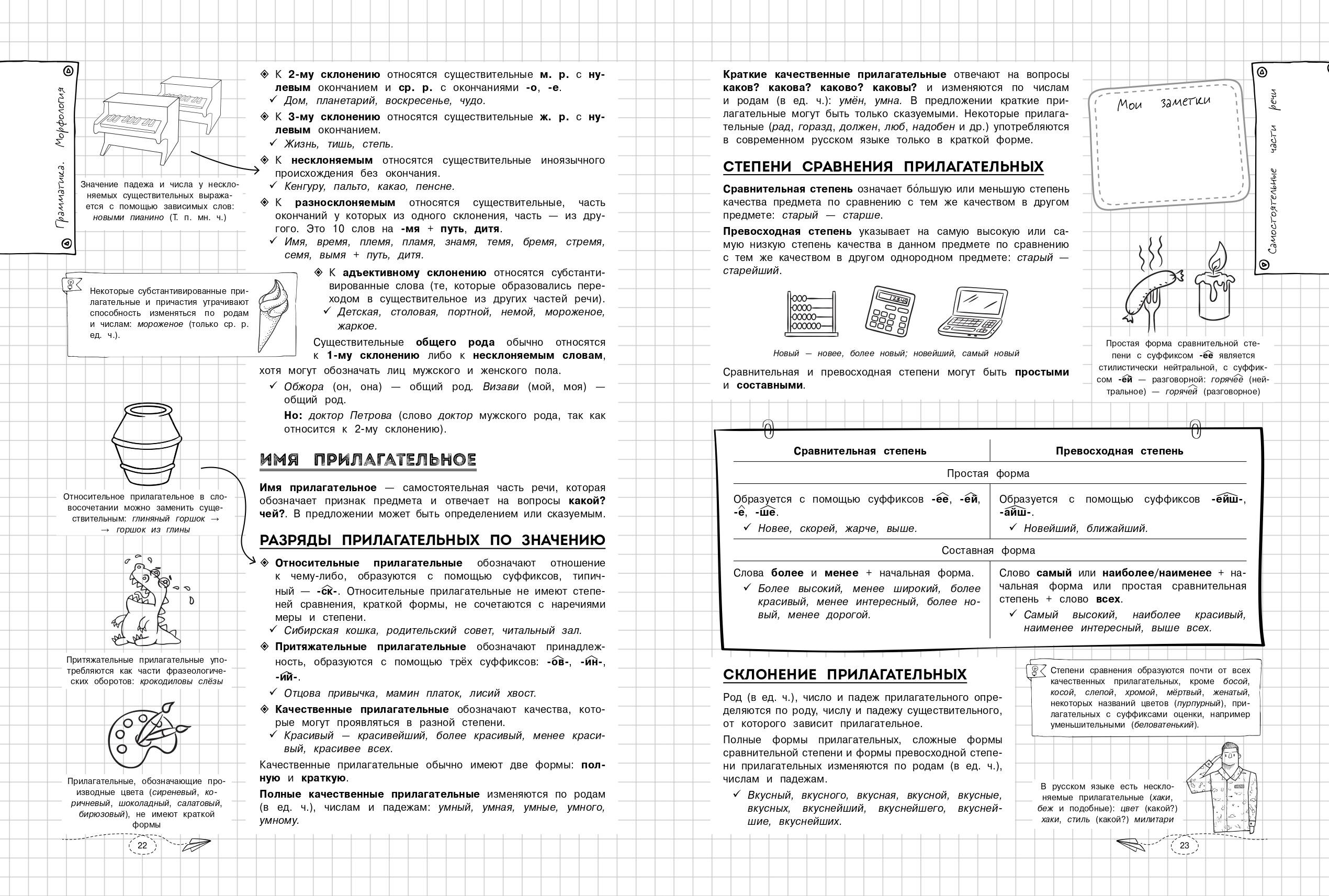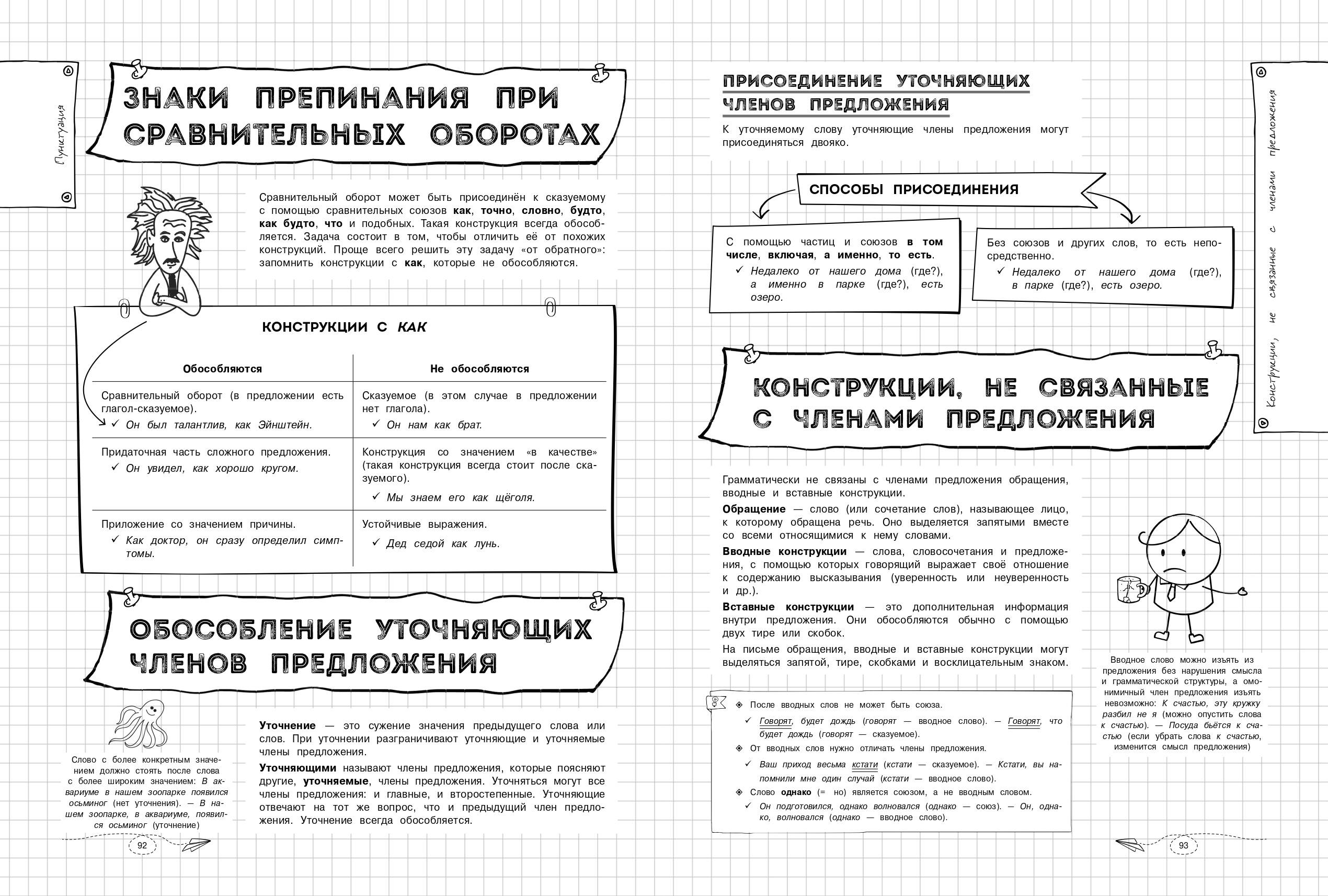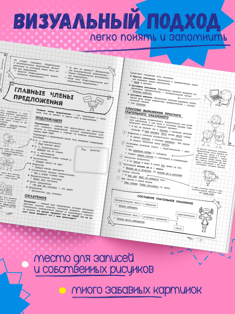 Справочник по русскому языку в наглядных конспектах для учеников 5, 6, 7, 8, 9, 10 и 11 классов превращает изучение каждой темы в увлекательное и познавательное приключение! Книга поможет запоминать и повторять материал на протяжении всего школьного курса. Благодаря наглядной подаче теории с примерами, схемами, а также забавными рисунками, текст становится доступным и интересным. Визуальный подход обеспечивает легкость восприятия и запоминания информации, ведь она оформлена в виде конспектов, словно ученик писал их сам. Всевозможные иллюстрации и места для собственных примеров и примечаний помогут сделать процесс обучения максимально простым и приятным! А при желании можно взять маркеры и сделать свой конспект еще более уникальным и персонализированным! • Все темы школьного курса. • Доступная подача материала. • Практические примеры. • Наглядные схемы и таблицы. • Множество забавных картинок. • Место для ваших записей и собственных рисунков. Погрузитесь в увлекательный мир русского языка вместе с наглядным справочником для подростков и почувствуйте, как знания становятся ближе, а учеба лучше! Книжка поможет подготовиться к ОГЭ, ЕГЭ и другим экзаменам 2026. Также пособие будет полезно для занятий родителей с детьми.| Издательство | ООО "Издательство "Эксмо" |