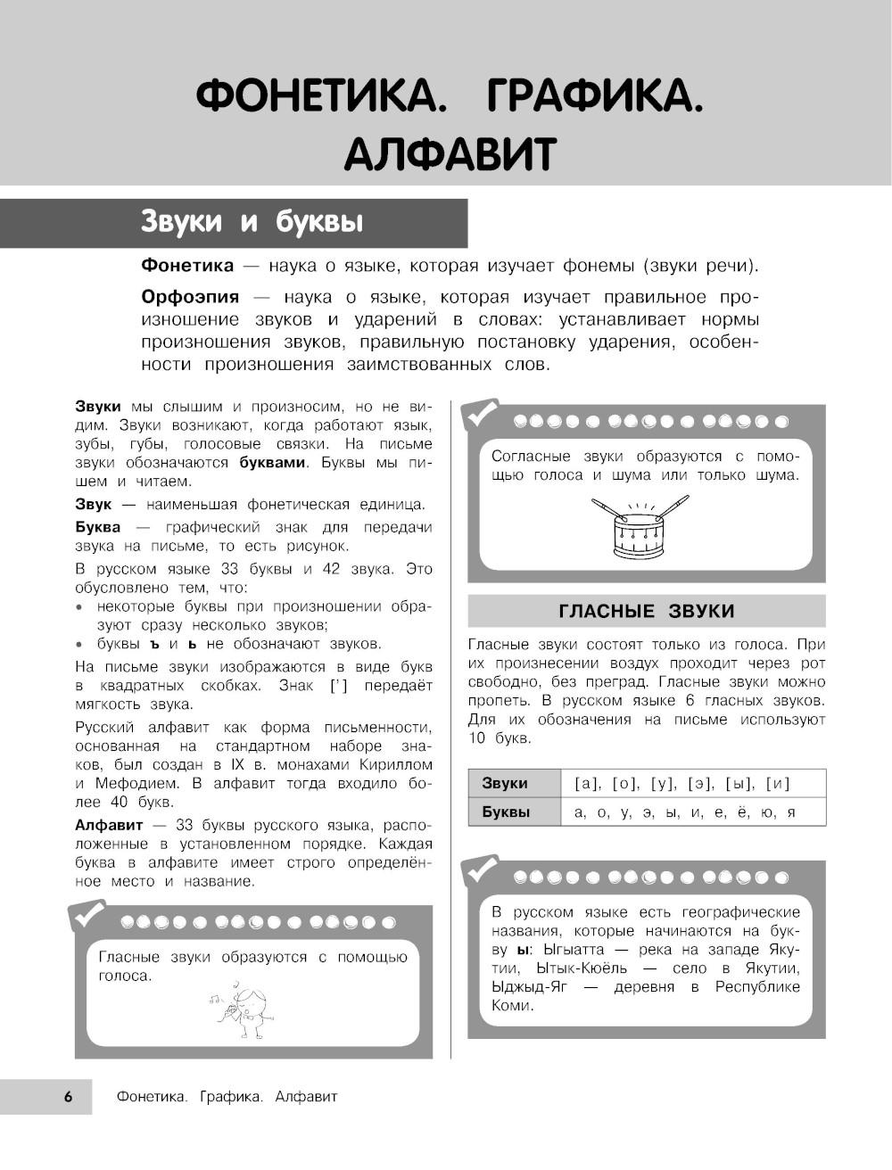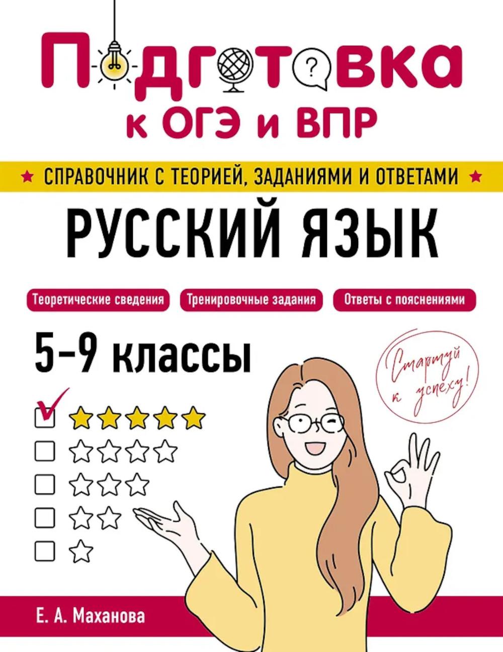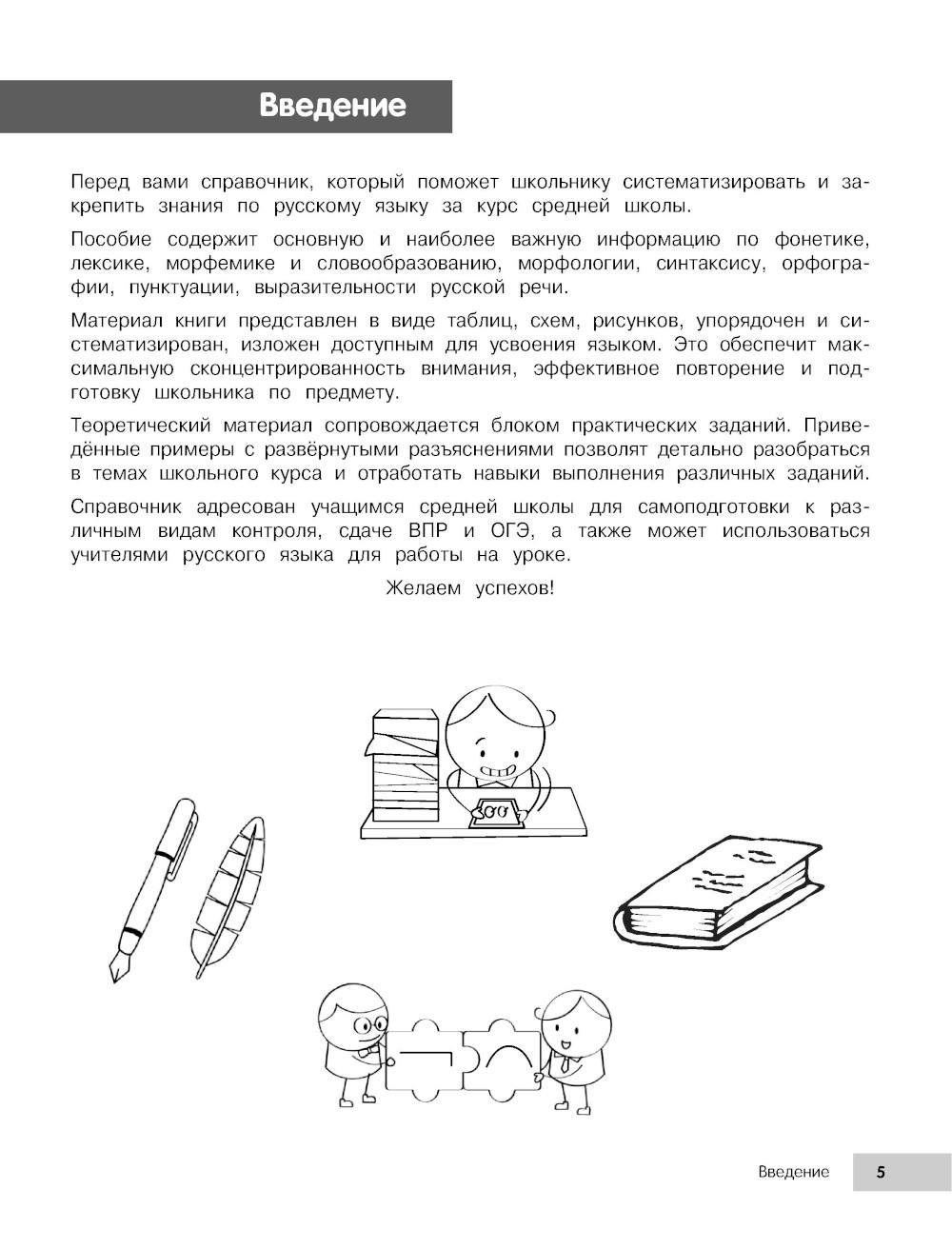Справочник содержит систематизированную информацию из школьной программы по русскому языку, необходимую для успешной сдачи контрольных и экзаменационных работ, а также ОГЭ и ВПР. Каждая тема разделена на четыре блока: подробные теоретические сведения, разбор типовых заданий, практику для самостоятельной работы и ответы с пояснениями. Все материалы сопровождаются наглядными таблицами, подробными схемами и рисунками. В теории выделены основные термины и факты, которые помогут сконцентрировать внимание школьника на наиболее важных аспектах темы. Пособие поможет закрепить все полученные в школе знания и обеспечит эффективную подготовку учеников 5-9 классов к урокам и экзаменам. Также книга будет полезна репетиторам и учителям при планировании и проведении занятий.| Издательство | Эксмо |