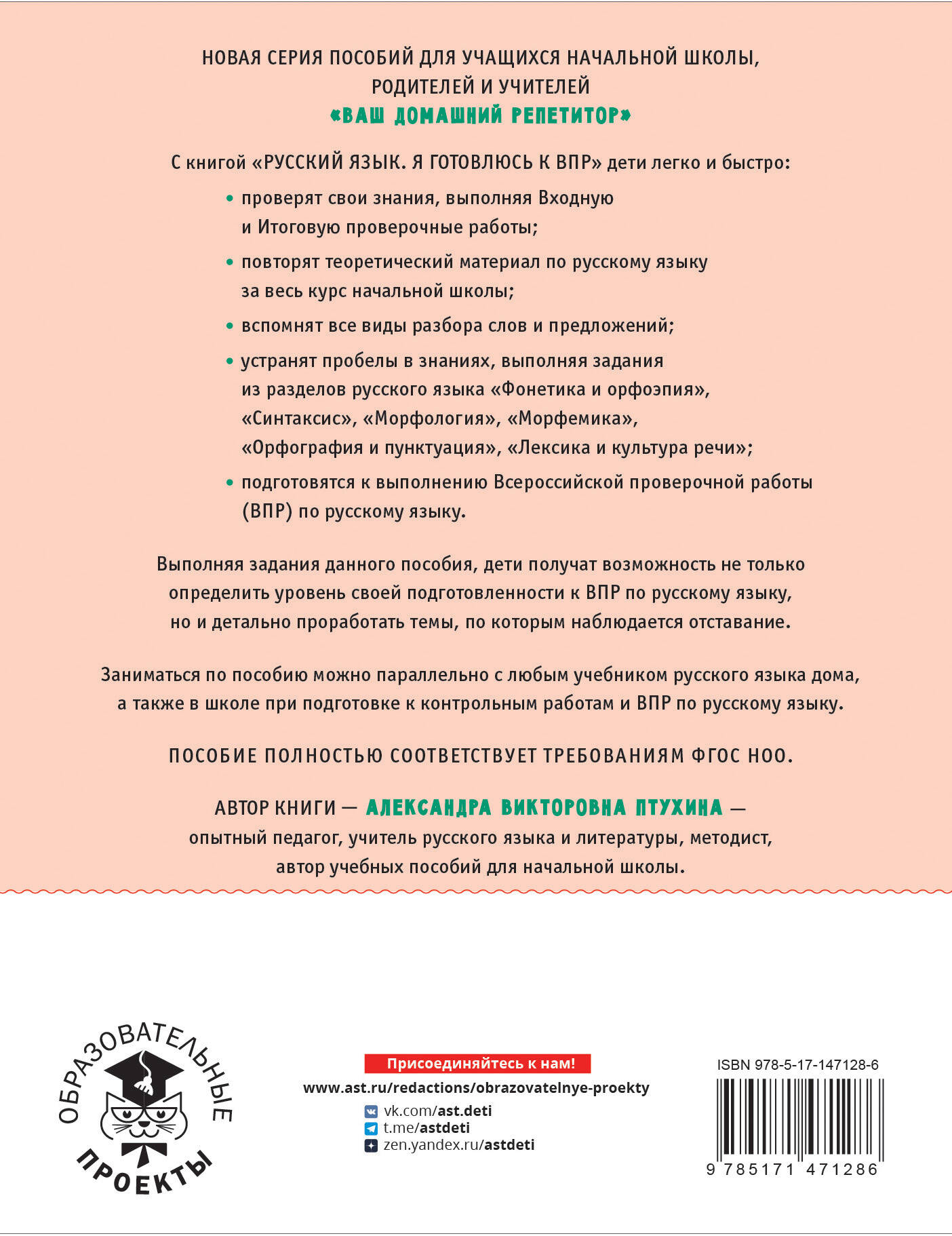 Выполняя задания данного пособия, обучающиеся получат возможность не только определить уровень своей подготовленности к Всероссийской проверочной работе (ВПР) по русскому языку, но и детально проработать темы, по которым наблюдается отставание. Пособие может быть использовано школьниками, занимающимися по любому из учебников, входящих в Федеральный перечень, поскольку полностью соответствует требованиям ФГОС НОО. Для обучающихся начальных классов общеобразовательных учебных заведений, преподавателей и репетиров.| Издательство | ИЗДАТЕЛЬСТВО "АСТ" |