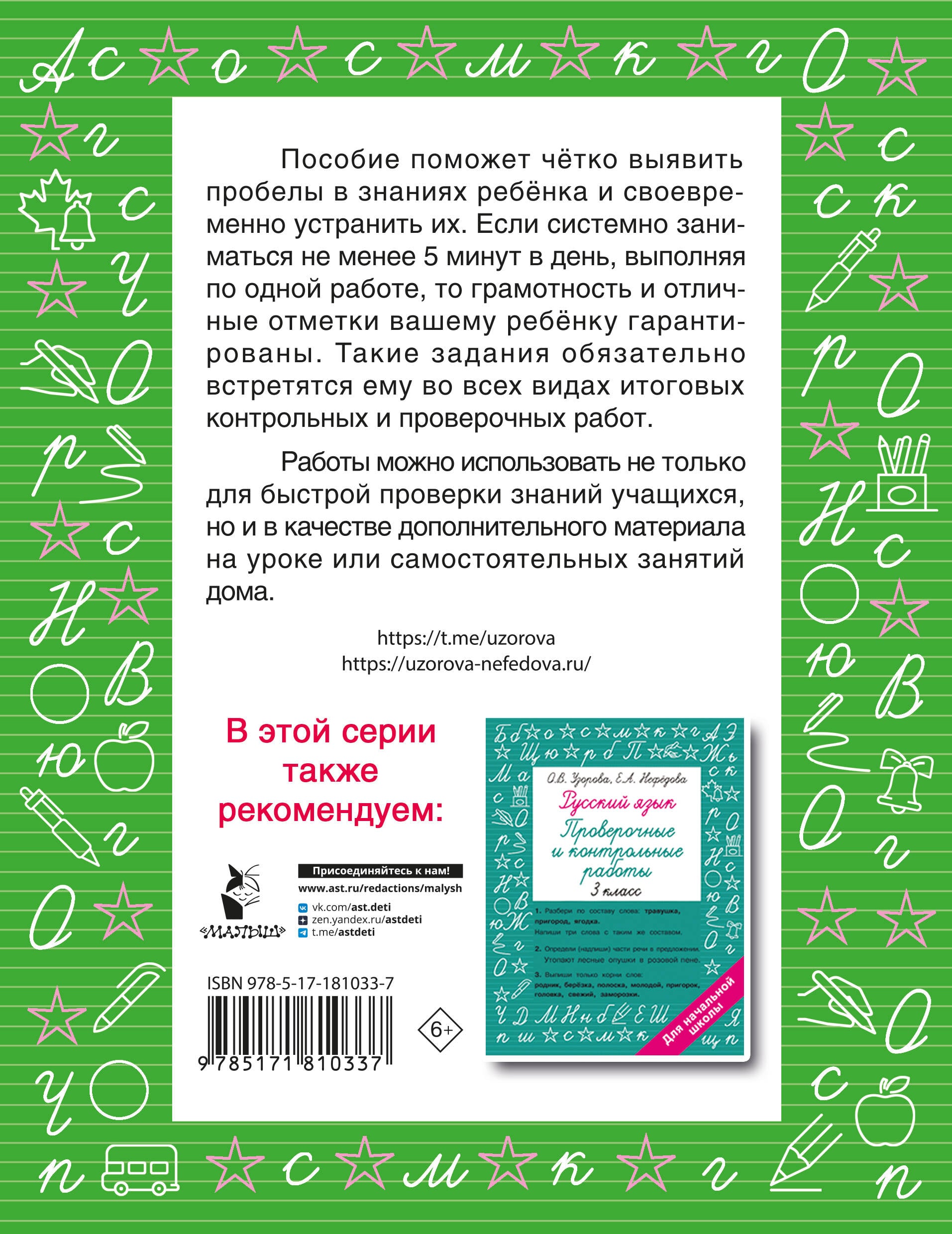 Задания пособия можно использовать не только для быстрой проверки знаний учащихся, но и в качестве дополнительного материала на уроке или самостоятельных занятий дома. Если системно заниматься по каждой теме ежедневно 5-10 минут, выполняя по одной работе в день, то грамотность и отличные отметки вашему ребёнку гарантированы. К тому же все виды грамматических заданий, в том числе тестовые, обязательно встретятся ему во всех видах итоговых контрольных и проверочных работ.| Издательство | Издательство "АСТ" |