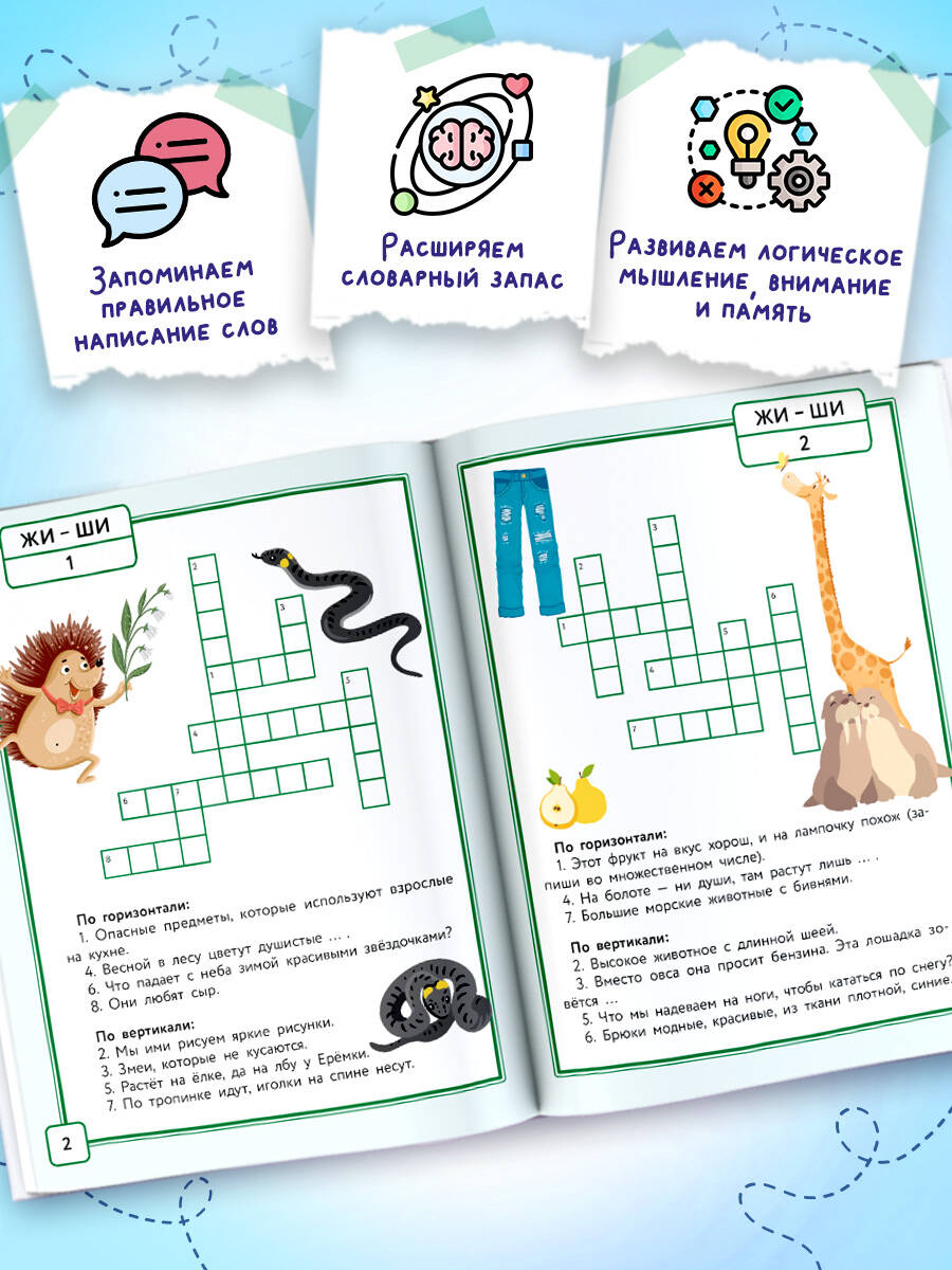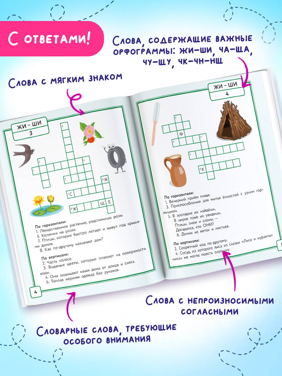 Вместо обычных слов в кроссвордах используются слова, содержащие важные орфограммы: жи-ши, ча-ща, чу-щу, чк-чн-нщ, слова с непроизносимыми согласными, слова с мягким знаком, а также словарные слова, требующие особого внимания. Разгадывая кроссворды, ребёнок не только запоминает правильное написание слов, но и развивает логическое мышление, внимание, память и расширяет словарный запас. Это пособие поможет вашему ребёнку писать грамотно и уверенно справляться со школьными заданиями.| Издательство | Издательство "АСТ" |