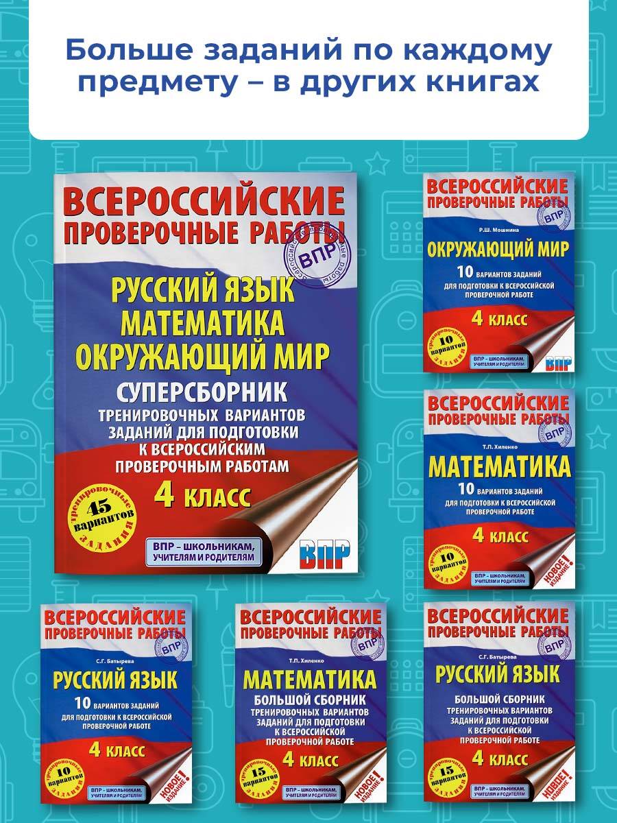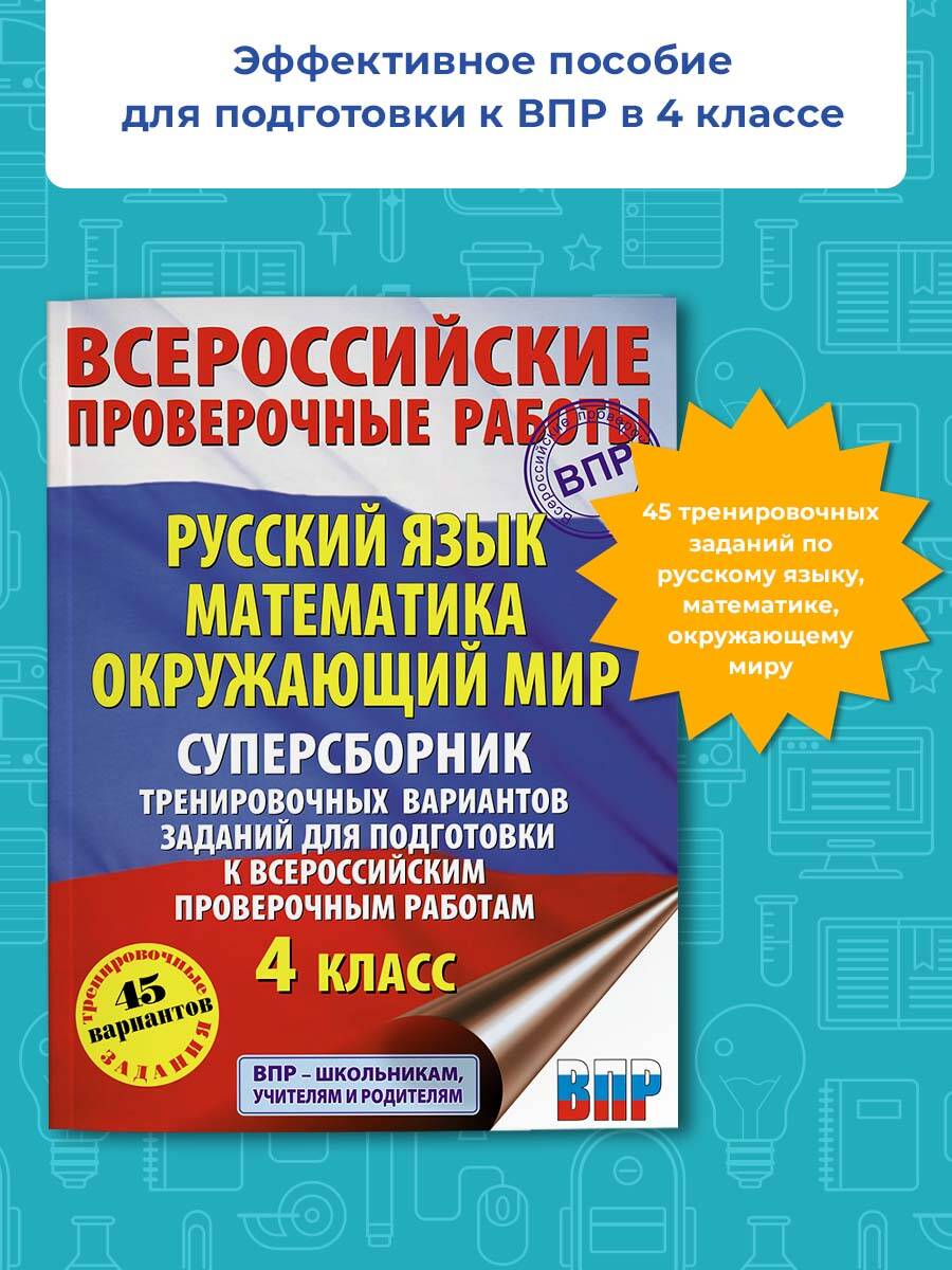 Аннотация: Русский язык. Математика. Окружающий мир. Суперсборник тренировочных вариантов заданий для подготовки к ВПР. 4 класс. 45 вариантов