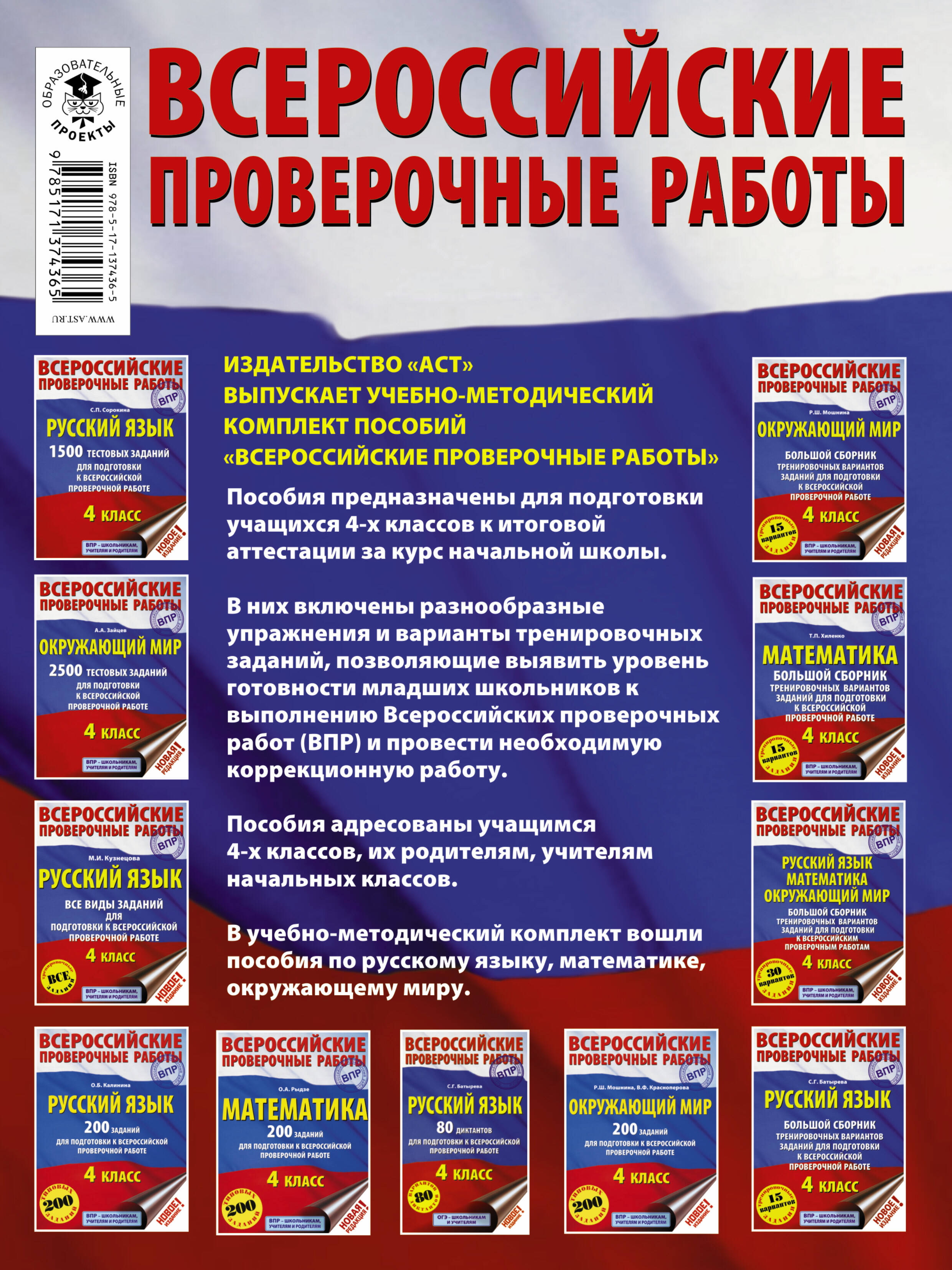 Книга предназначена для подготовки учащихся 4-х классов к итоговой аттестации за курс начальной школы. Учащиеся познакомятся со структурой и содержанием всероссийской проверочной работы по русскому языку, математике, окружающему миру, узнают о количестве заданий, их форме и уровне сложности. Для отработки школьниками навыка выполнения проверочных работ в книге предлагается 45 вариантов тренировочных заданий по всем предметам. Работа с пособием позволит выявить уровень готовности младших школьников к выполнению ВПР и своевременно провести необходимую коррекционную работу. Структура, содержание и объём тренировочных заданий соответствуют демоверсиям всероссийской проверочной работы по русскому языку, математике и окружающему миру. Для удобства работы в пособие также включены варианты диктантов, кодификаторы и ответы ко всем заданиям. Работа с пособием поможет выпускникам начальной школы быстро и качественно подготовиться к выполнению всероссийских проверочных работ. Книга адресована учащимся 4-х классов, их родителям, учителям начальных классов.| Издательство | ИЗДАТЕЛЬСТВО "АСТ" |