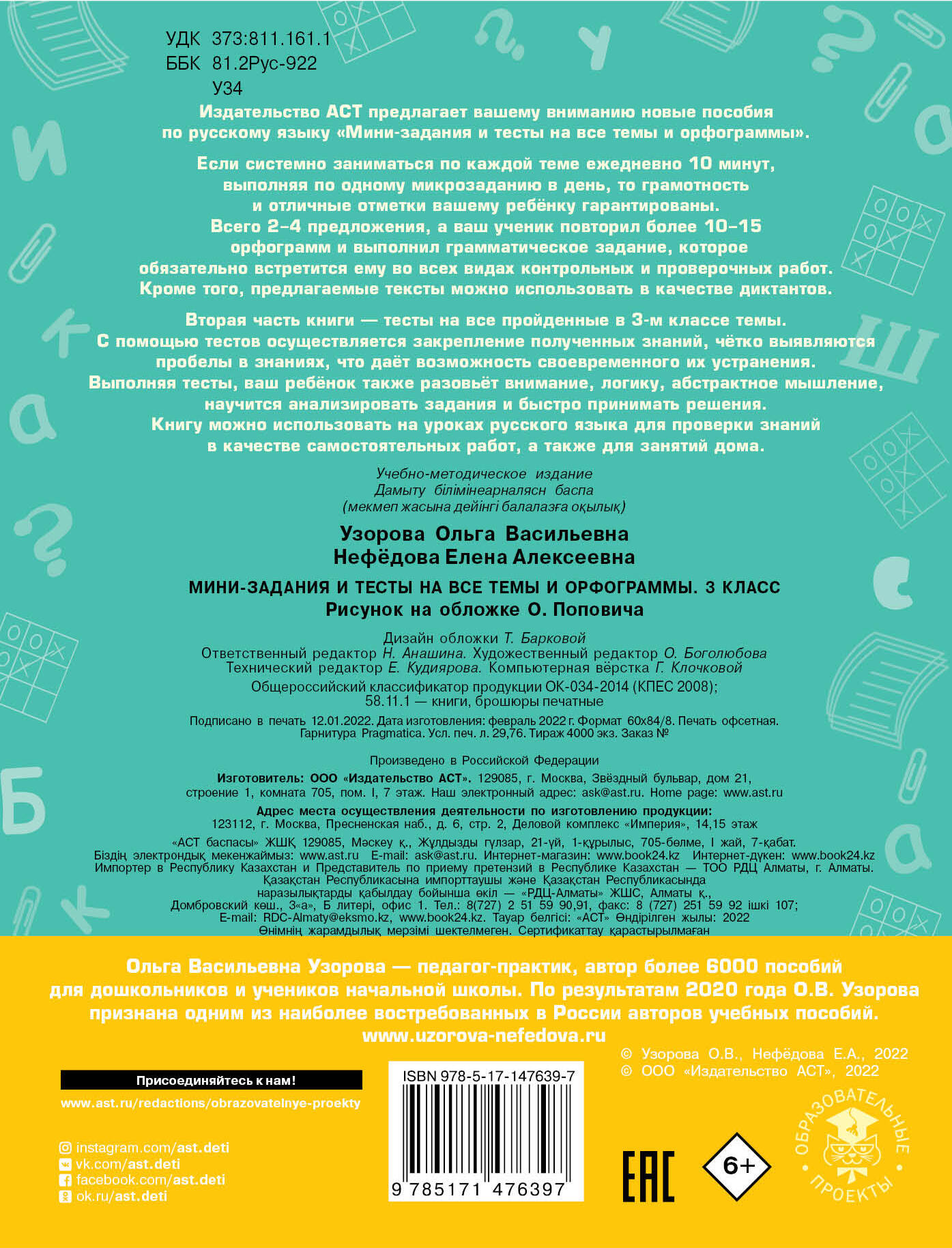 Издательство АСТ предлагает вашему вниманию новые пособия по русскому языку «Мини-задания и тесты на все правила и орфограммы». Если системно заниматься по каждой теме ежедневно 10 минут, выполняя по одному микро-заданию в день, то грамотность и отличные отметки вашему ребёнку гарантированы. Всего 2-4 предложения, а ваш ученик повторил более 10-15 орфограмм и выполнил грамматическое задание, которое обязательно встретится ему во всех видах контрольных и проверочных работ. Кроме того, предлагаемые тексты можно использовать в качестве диктантов. Вторая часть книги - тесты на все пройденные в 3-м классе темы. С помощью тестов осуществляется закрепление полученных знаний, чётко выявляются пробелы в знаниях, что даёт возможность своевременного их устранения. Выполняя тесты, ваш ребёнок также разовьёт внимание, логику, абстрактное мышление, научится анализировать задания и быстро принимать решения. Книгу можно использовать на уроках русского языка для проверки знаний в качестве самостоятельных работ, а также для занятий дома.| Издательство | АСТ |