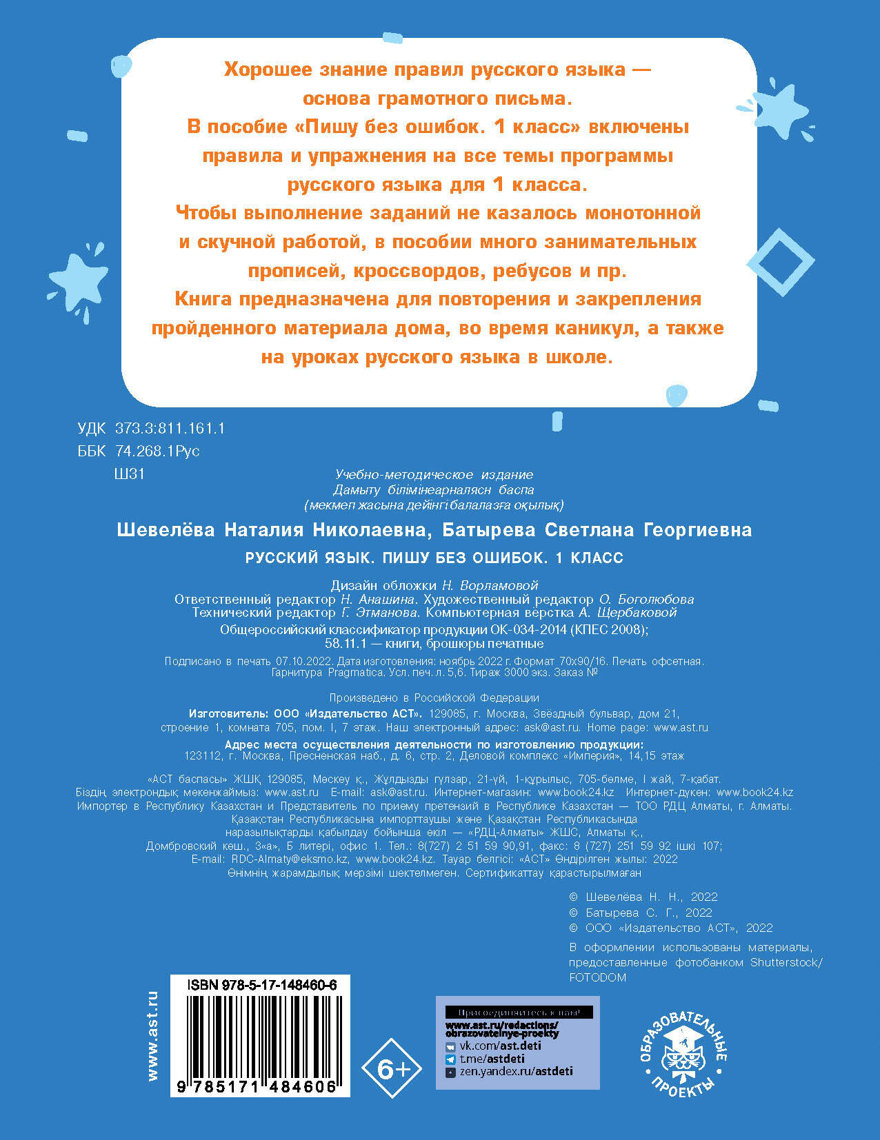 Хорошее знание правил русского языка - основа грамотного письма. В пособие "Пишу без ошибок. 1 класс" включены правила и упражнения на все темы программы русского языка для 1 класса. Чтобы выполнение заданий не казалось монотонной и скучной работой, в пособии много занимательных прописей, кроссвордов, ребусов и пр. Книга предназначена для повторения и закрепления пройденного материала дома, во время каникул, а также на уроках русского языка в школе.| Издательство | ИЗДАТЕЛЬСТВО "АСТ" |