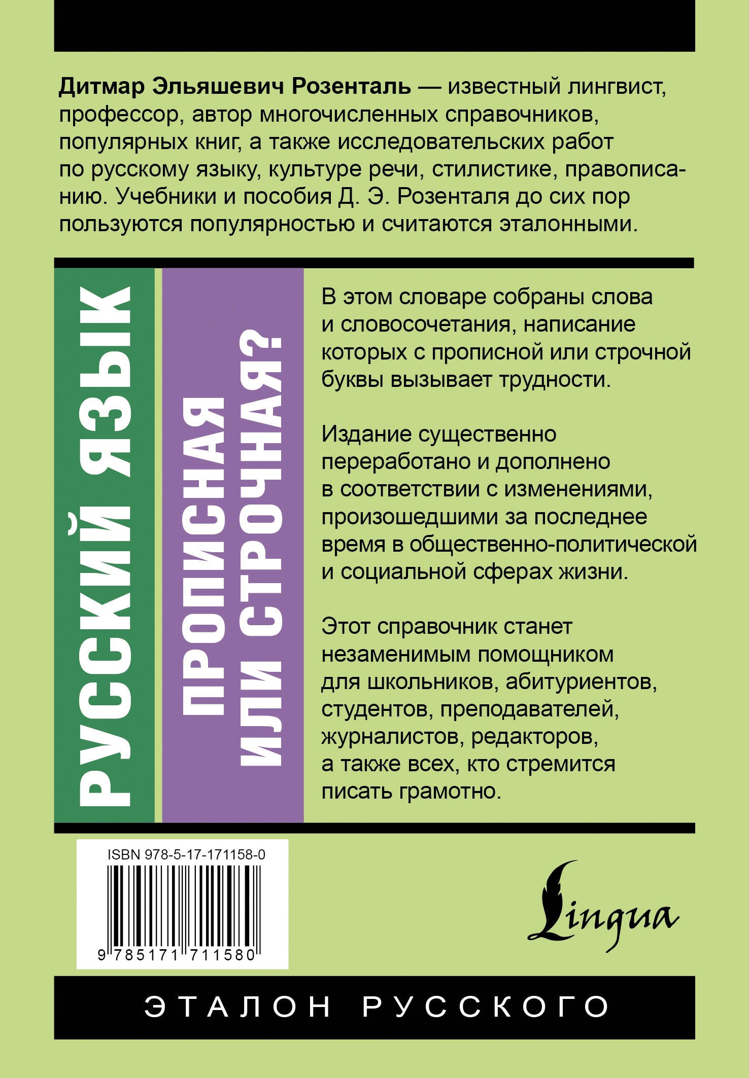 Розенталь Дитмар Эльяшевич - лингвист, профессор, известный автор многочисленных справочников по русскому языку, стилистике, правописанию, культуре речи. Его труды по сей день считаются эталонными и востребованными. В словаре собраны слова и словосочетания, написание которых с прописной или строчной буквы вызывает затруднения. Издание существенно переработано и дополнено в связи с последними изменениями, произошедшими в общественно-политической и социальной сферах жизни. Данный справочник проверен временем и актуален для изучения современного русского языка. Справочник будет полезен школьникам, абитуриентам, студентам, а также преподавателям, корректорам, редакторам, журналистам и всем, кто стремится писать грамотно.| Издательство | Издательство "АСТ" |