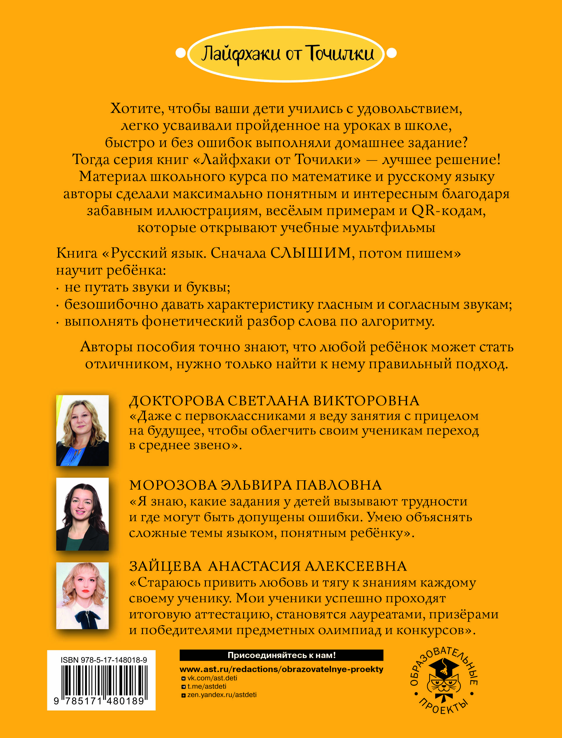 Хотите, чтобы ваши дети учились с удовольствием, легко усваивали пройденное на уроках в школе, быстро и без ошибок выполняли домашнее задание? Тогда серия книг "Лайфхаки от Точилки" - лучшее решение! Материал школьного курса по математике и русскому языку авторы сделали максимально понятным и интересным благодаря забавным иллюстрациям, весёлым примерам и QR-кодам, которые открывают учебные мультфильмы. Книга "Русский язык. Сначала СЛЫШИМ, потом пишем" научит ребёнка: . не путать звуки и буквы; . безошибочно давать характеристику гласным и согласным звукам; . выполнять фонетический разбор слова по алгоритму. Авторы пособия точно знают, что любой ребёнок может стать отличником, нужно только найти к нему правильный подход.