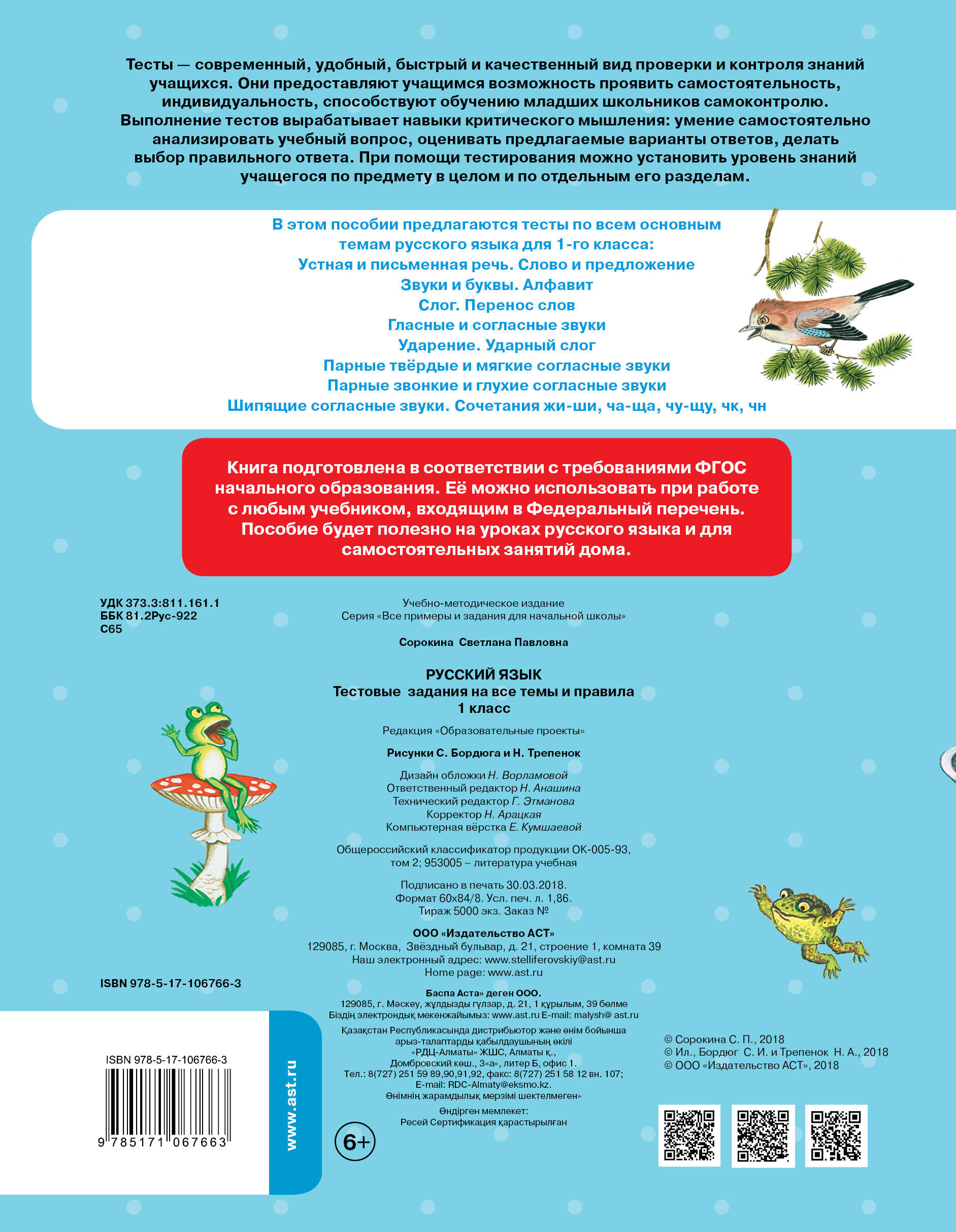 Тесты - современный, удобный, быстрый и качественный вид проверки и контроля знаний учащихся. Они предоставляют учащимся возможность проявить самостоятельность, индивидуальность, способствуют обучению младших школьников самоконтролю. Выполнение тестов вырабатывает навыки критического мышления: умение самостоятельно анализировать учебный вопрос, оценивать предлагаемые варианты ответов, делать выбор правильного ответа. При помощи тестирования можно установить уровень знаний учащегося по предмету в целом и по отдельным его разделам. В этом пособии предлагаются тесты по всем основным темам русского языка для 1-го класса: - Устная и письменная речь. Слово и предложение. - Звуки и буквы. Алфавит. - Слог. Перенос слов. - Гласные и согласные звуки. - Ударение. Ударный слог. - Парные твердые и мягкие согласные звуки. - Парные звонкие и глухие согласные звуки. - Шипящие согласные звуки. Сочетания жи-ши, ча-ща, чу-щу, чк, чн. Пособие подготовлено в соответствии с требованиями ФГОС начального образования. Его можно использовать при работе с любым учебником, входящим в Федеральный перечень. Книга будет полезна на уроках русского языка и для самостоятельных занятий дома.