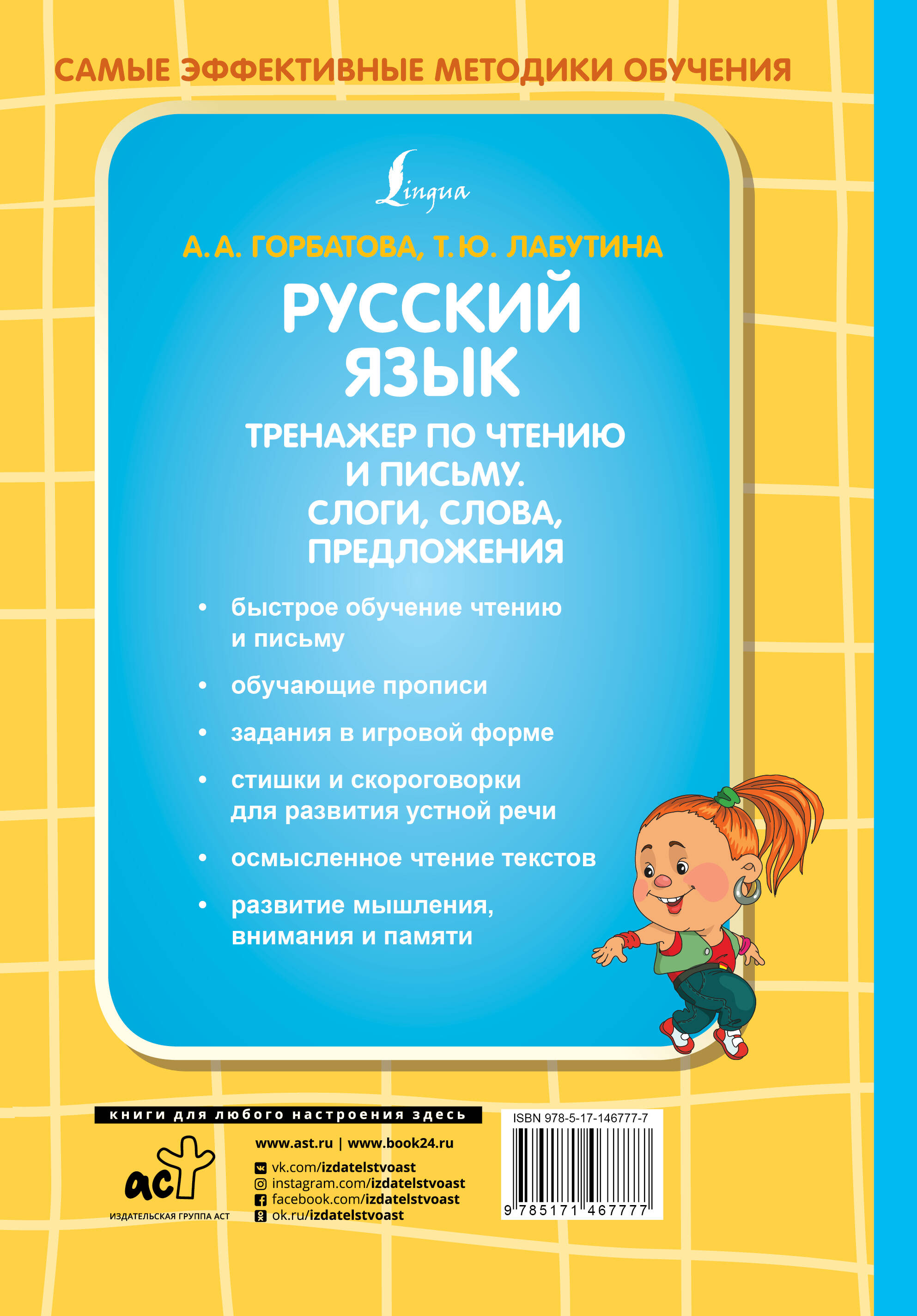 Книга "Русский язык. Тренажер по чтению и письму. Слоги, слова, предложения" - это: • быстрое обучение чтению и письму • обучающие прописи • задания в игровой форме • стишки и скороговорки для развития устной речи • осмысленное чтение текстов • развитие мышления, внимания и памяти| Издательство | ИЗДАТЕЛЬСТВО "АСТ" |