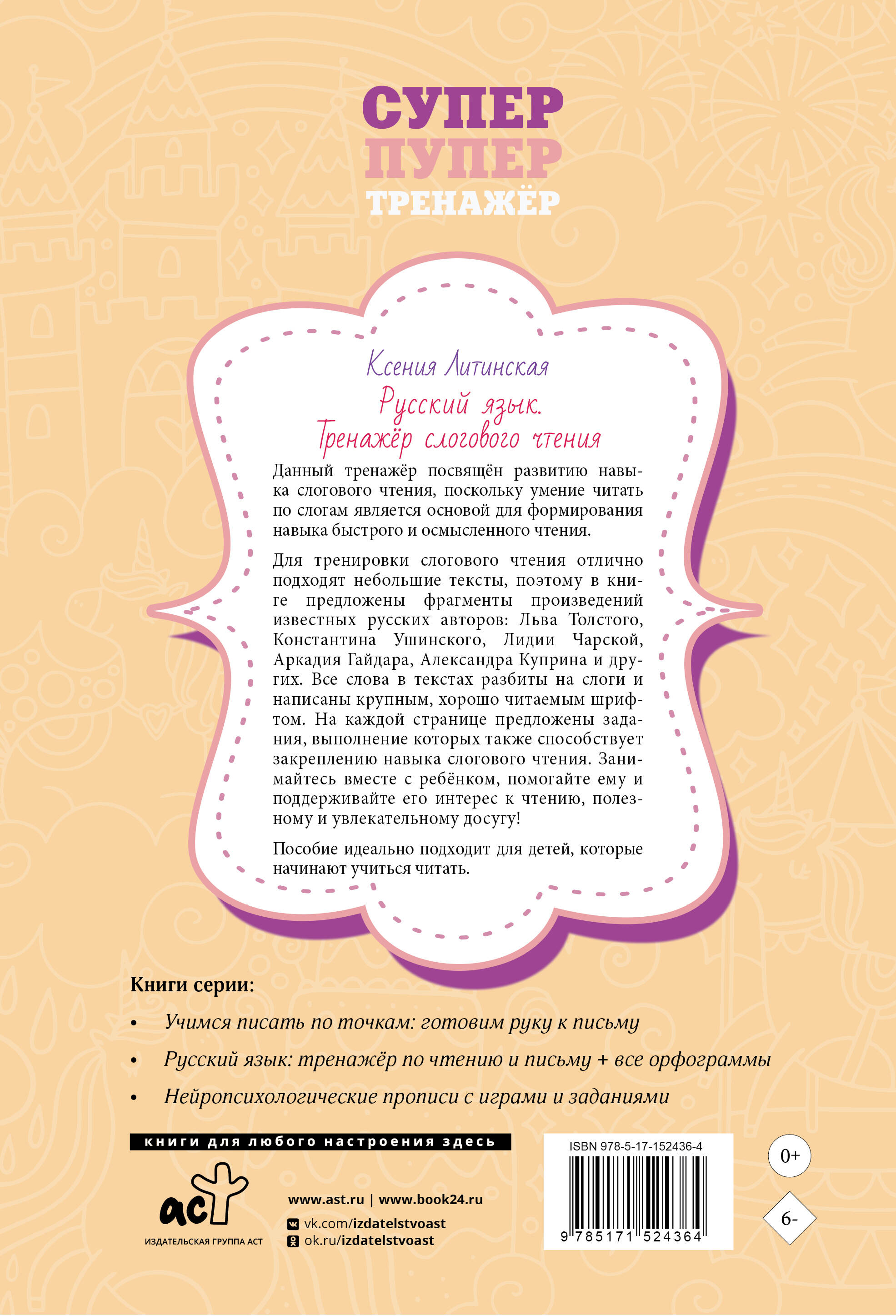 Данный тренажёр посвящён развитию навыка слогового чтения, поскольку умение читать по слогам является основой для формирования навыка быстрого и осмысленного чтения. Для тренировки слогового чтения отлично подходят небольшие тексты, поэтому в книге предложены фрагменты произведений известных русских авторов: Льва Толстого, Константина Ушинского, Лидии Чарской, Аркадия Гайдара, Александра Куприна и других. Все слова в текстах разбиты на слоги и написаны крупным, хорошо читаемым шрифтом. На каждой странице предложены задания, выполнение которых также способствует закреплению навыка слогового чтения. Занимайтесь вместе с ребёнком, помогайте ему и поддерживайте его интерес к чтению, полезному и увлекательному досугу! Пособие удобного формата идеально подходит для детей, которые начинают учиться читать.| Издательство | ИЗДАТЕЛЬСТВО "АСТ" |