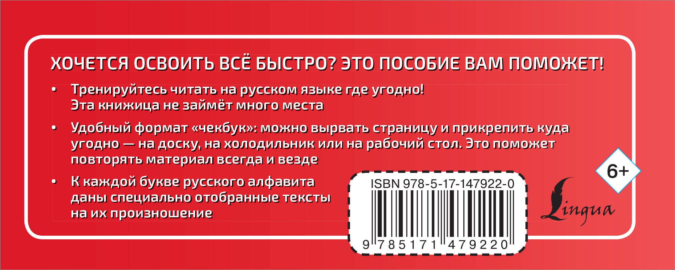 Анастасия Андреевна Горбатова - автор популярных пособий по русскому языку для взрослых и детей. Автор предлагает новый эффективный способ овладения навыками чтения. Материал сопровождается большим количеством примеров и текстов для проработки произношения каждой отдельной буквы русского алфавита. Удобный формат издания позволит оттачивать навыки чтения где угодно, а страницы "чекбук" предполагают возможность вырвать их и прикрепить куда угодно, чтобы материал был всегда на виду.| Издательство | АСТ |