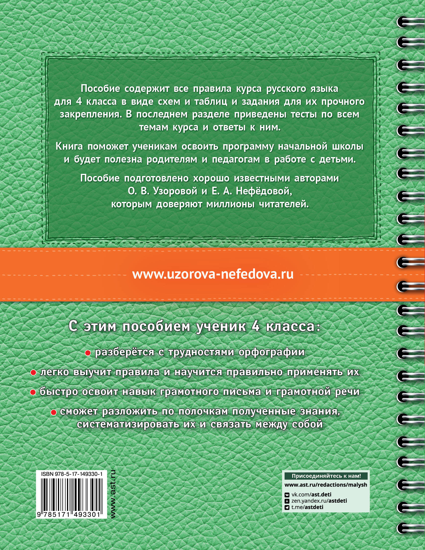 Хотите помочь ребёнку лучше учиться и систематизировать свои знания? Это пособие содержит все правила курса русского языка для четвертого класса в виде схем и таблиц и задания для их прочного закрепления. В последнем разделе приведены тесты по всем темам курса и ответы к ним. Пособие составлено экспертами детского образования, которым доверяют миллионы - О.В. Узоровой и Е.А. Нефёдовой. С этим пособием первоклассник легко выучит правила и научится правильно применять их, быстро освоит навык грамотного письма и грамотной речи. Ребёнок сможет разложить по полочкам полученные знания, систематизировать их и связать между собой. Помогите ребёнку ходить в школу с радостью!| Издательство | ИЗДАТЕЛЬСТВО "АСТ" |