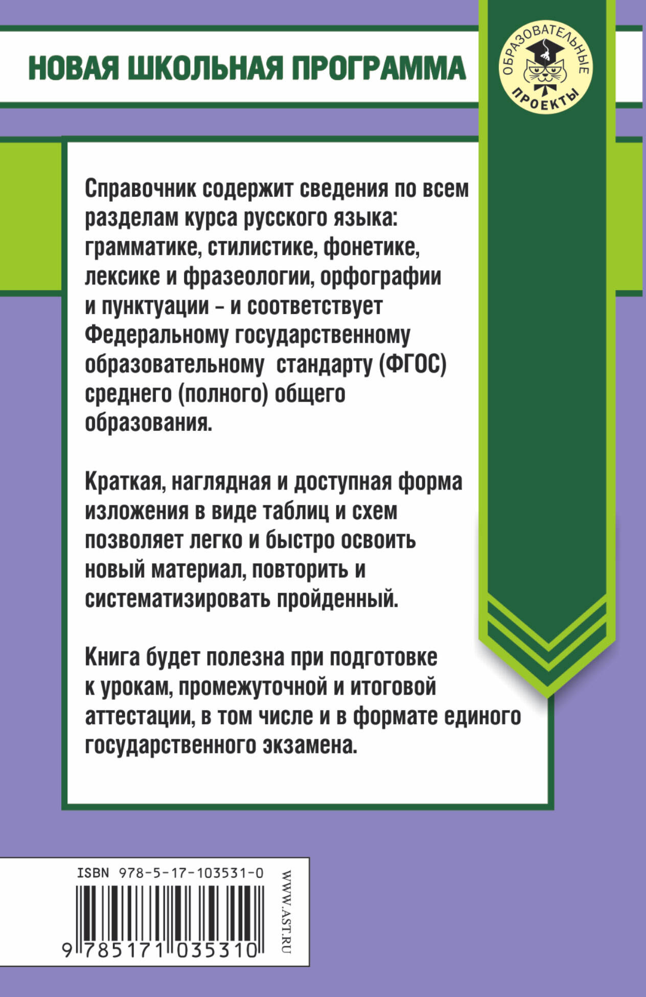 Справочник содержит сведения по всем разделам курса русского языка: грамматике, стилистике, фонетике, лексике и фразеологии, орфографии и пунктуации - и соответствует Федеральному государственному образовательному (ФГОС) среднего (полного) общего образования. Краткая, наглядная и доступная форма изложения в виде таблиц и схем позволяет легко и быстро освоить новый материал, повторить и систематизировать пройденный. Книга будет полезна при подготовке к урокам, промежуточной и итоговой аттестации, в том числе и в формате единого государственного экзамена.