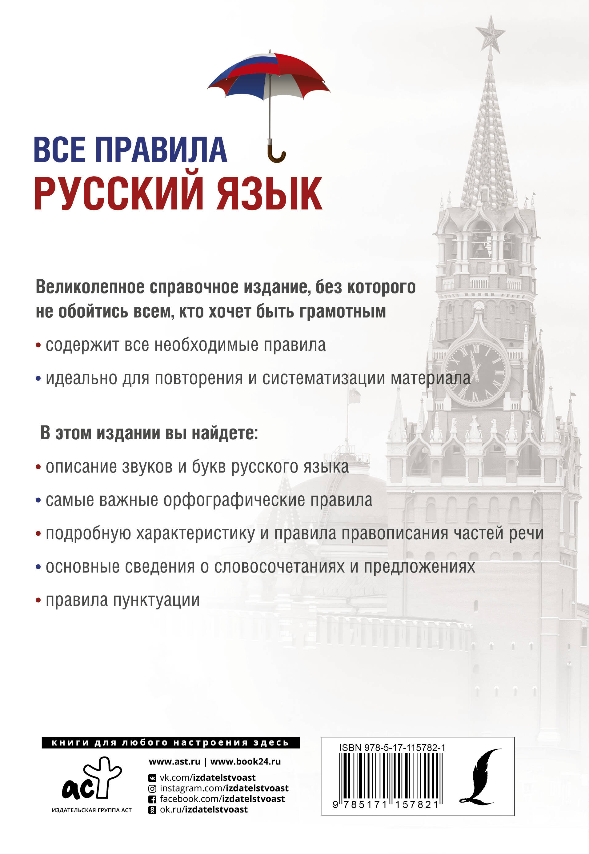 Данное пособие поможет в короткий срок освежить свои знания по основным разделам русского языка: фонетике, орфографии, пунктуации, словообразованию, лексике, морфологии, синтаксису. Наглядные схемы и таблицы облегчают понимание и запоминание материала. К каждой теме даны упражнения для тренировки и закрепления пройденного. В конце книги вы найдете ключи к упражнениям и полезные приложения. Издание адресовано всем, кто хочет быть грамотным.| Издательство | Издательство "АСТ" |