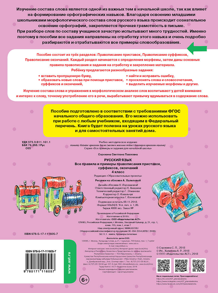 Изучение состава слова является одной из важных тем в начальной школе, так как влияет на формирование орфографических навыков. Благодаря освоению младшими школьниками морфологического состава слов русского языка происходит сознательное освоение орфографии, закрепляется прочная грамотность в письме. При разборе слов по составу учащиеся зачастую испытывают много трудностей. Именно поэтому в пособии все задания направлены на отработку этого навыка и очень подробно разбираются и отрабатываются все примеры словообразования. Пособие состоит из трёх разделов: Правописание приставок, Правописание суффиксов, Правописание окончаний. Каждый раздел начинается с определения морфемы, затем даны основные правила правописания и задания на отработку и закрепление материала. Ребёнку предлагаются разнообразные задания: - вставить пропущенную букву, - образовать новые слова при помощи приставок, суффиксов и окончаний, - найти и исправить ошибку, - просклонять словосочетания, - выделить изучаемые морфемы и другие. Изучение состава слова и упражнения в морфологическом анализе слов воспитывают у детей внимание и интерес к слову, точному употреблению его в речи, вырабатывают привычку вдумываться в содержание слова.| Издательство | ИЗДАТЕЛЬСТВО "АСТ" |