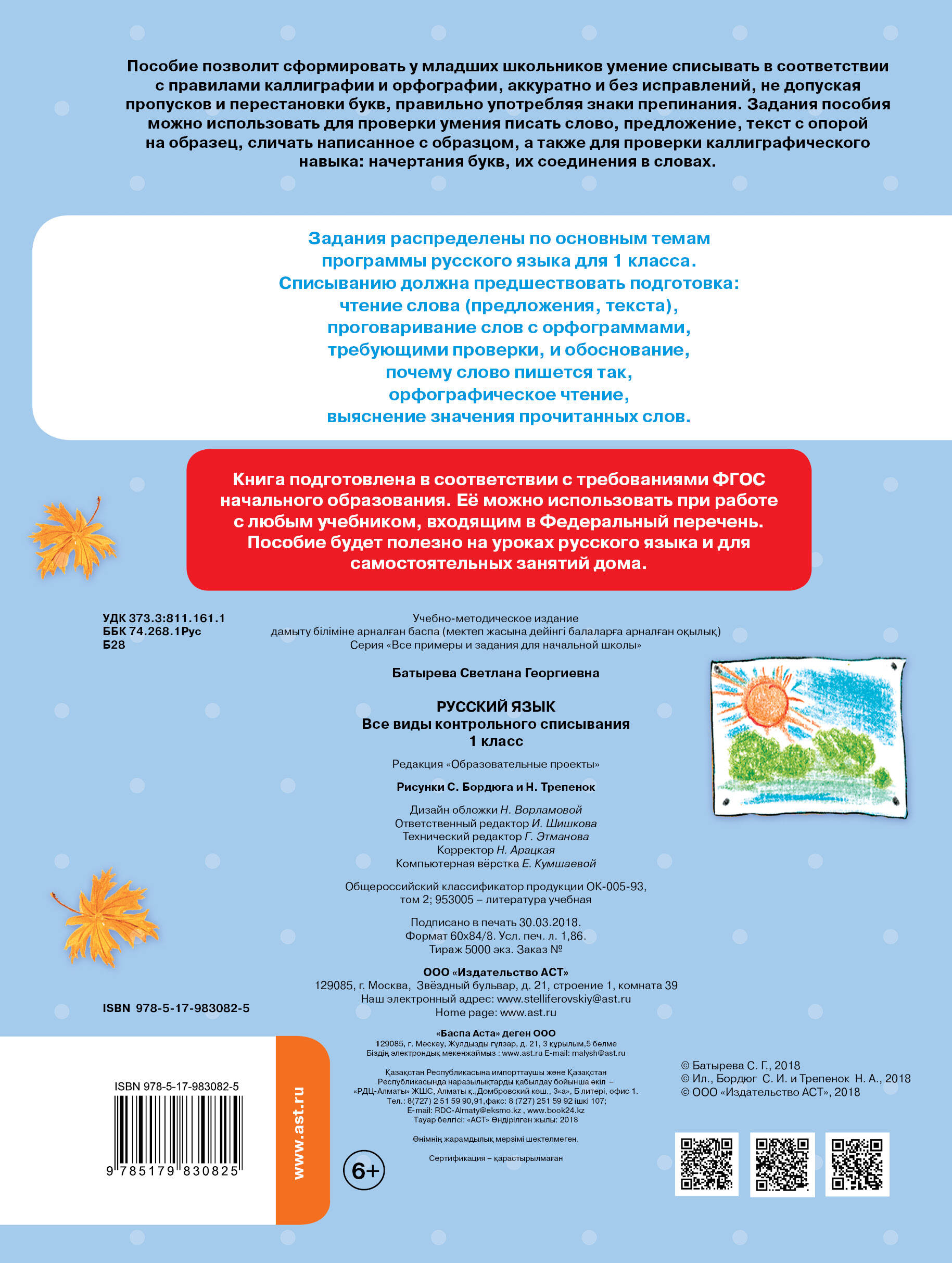 Пособие позволит сформировать у младших школьников умение списывать в соответствии с правилами каллиграфии и орфографии, аккуратно и без исправлений, не допуская пропусков и перестановки букв, правильно употребляя знаки препинания. Задания пособия можно использовать для проверки умения писать слово, предложение, текст с опорой на образец, сличать написанное с образцом, а также для проверки каллиграфического навыка: начертания букв, их соединения в словах (контрольного списывания). Задания распределены по основным темам программы русского языка для 1 класса.| Издательство | ИЗДАТЕЛЬСТВО "АСТ" |
