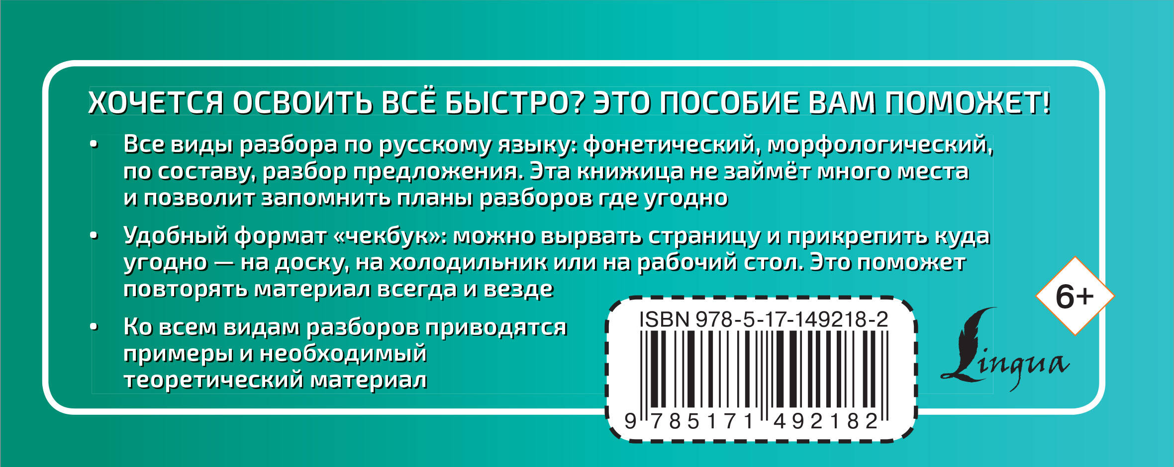 Новый способ выучить все виды разборов по русскому языку. Компактный формат "чекбук" способствует многократному повторению материала, страницы можно вырвать и использовать в качестве шпаргалок. Все планы разборов сопровождаются необходимым теоретическим материалом, а также многочисленными примерами.| Издательство | ИЗДАТЕЛЬСТВО "АСТ" |