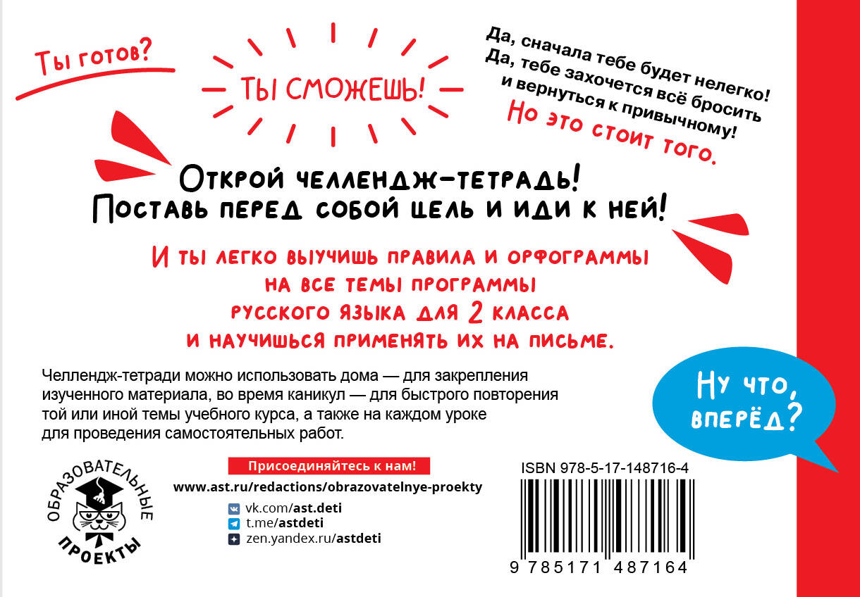 Челлендж (проблема, сложная задача, вызов) - это отличная возможность ставить перед собой цель и идти к её выполнению. Это - возможность чётко планировать свои действия на определённый срок: день, неделя, месяц, учебная четверть, полугодие и пр. Это своего рода соревнование: кто быстрее, качественнее. Задания в челлендж-тетради небольшие: 1-2 задания на 1 занятие. Каждое занятие проверяет и оценивает сначала сам ребёнок (смайлики), затем взрослый: учитель, педагог или родитель. Как только ребёнок привыкает к такому виду работы (3-5 занятие), предлагаем усложнить задачу - проставить время выполнения заданий. Время пошло. Уместно также устроить соревнование на скорость выполнения заданий в классе. Соревновательный характер выполнения заданий и челленджей делает учебный процесс увлекательным и интересным, учит ребёнка ставить перед собой выполнимые цели и самостоятельно решать их. Челлендж-тетради приучат младшего школьника к самообучению, самопроверке и самооценке. С челлендж-тетрадью «Выучу все правила» ваш ребенок выучит все правила и орфограммы на все темы программы русского языка для 4 класса и научится применять их на письме. Можно использовать челлендж-тетради дома для закрепления изученного материала на уроке, во время каникул, для быстрого повторения той или иной темы учебного курса, на каждом уроке для проведения самостоятельных работ,.| Издательство | ИЗДАТЕЛЬСТВО "АСТ" |