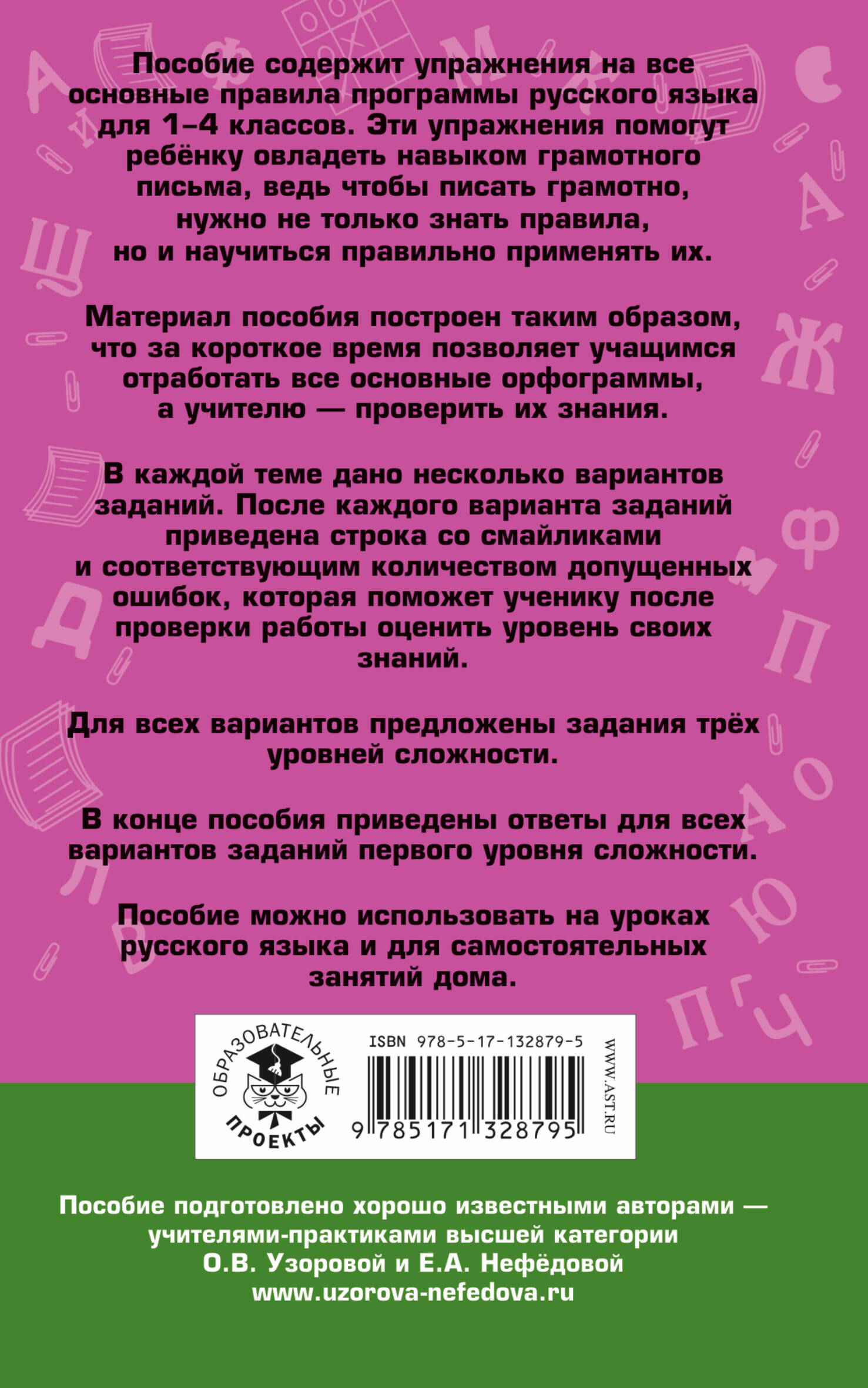 Пособие содержит упражнения на все основные правила программы русского языка для 1-4 классов. Эти упражнения помогут ребёнку овладеть навыком грамотного письма. Материал пособия построен таким образом, что за короткое время позволяет учащимся отработать все основные орфограммы, а учителю - проверить их знания. В каждой теме дано несколько вариантов заданий. После каждого варианта заданий приведена строка со смайликами и соответствующим количеством допущенных ошибок, которая поможет ученику после проверки работы оценить уровень своих знаний. Для всех вариантов предложены задания трех уровней сложности. В конце пособия приведены ответы для всех вариантов заданий первого уровня сложности. Пособие можно использовать на уроках русского языка и для самостоятельных занятий дома.| Издательство | ИЗДАТЕЛЬСТВО "АСТ" |