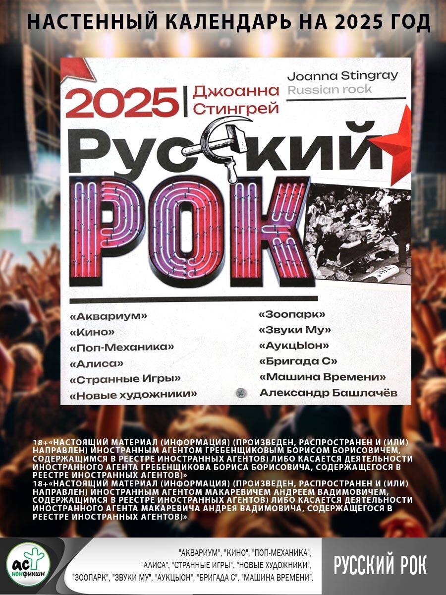 Аннотация: Русский рок. "Аквариум", "Кино", "Поп-Механика", "Алиса", "Странные Игры", "Новые художники", "Зоопарк", "Звуки Му", "АукцЫон", "Бригада С", "Машина Времени", Александр Башлачёв. Календарь на 2025 год