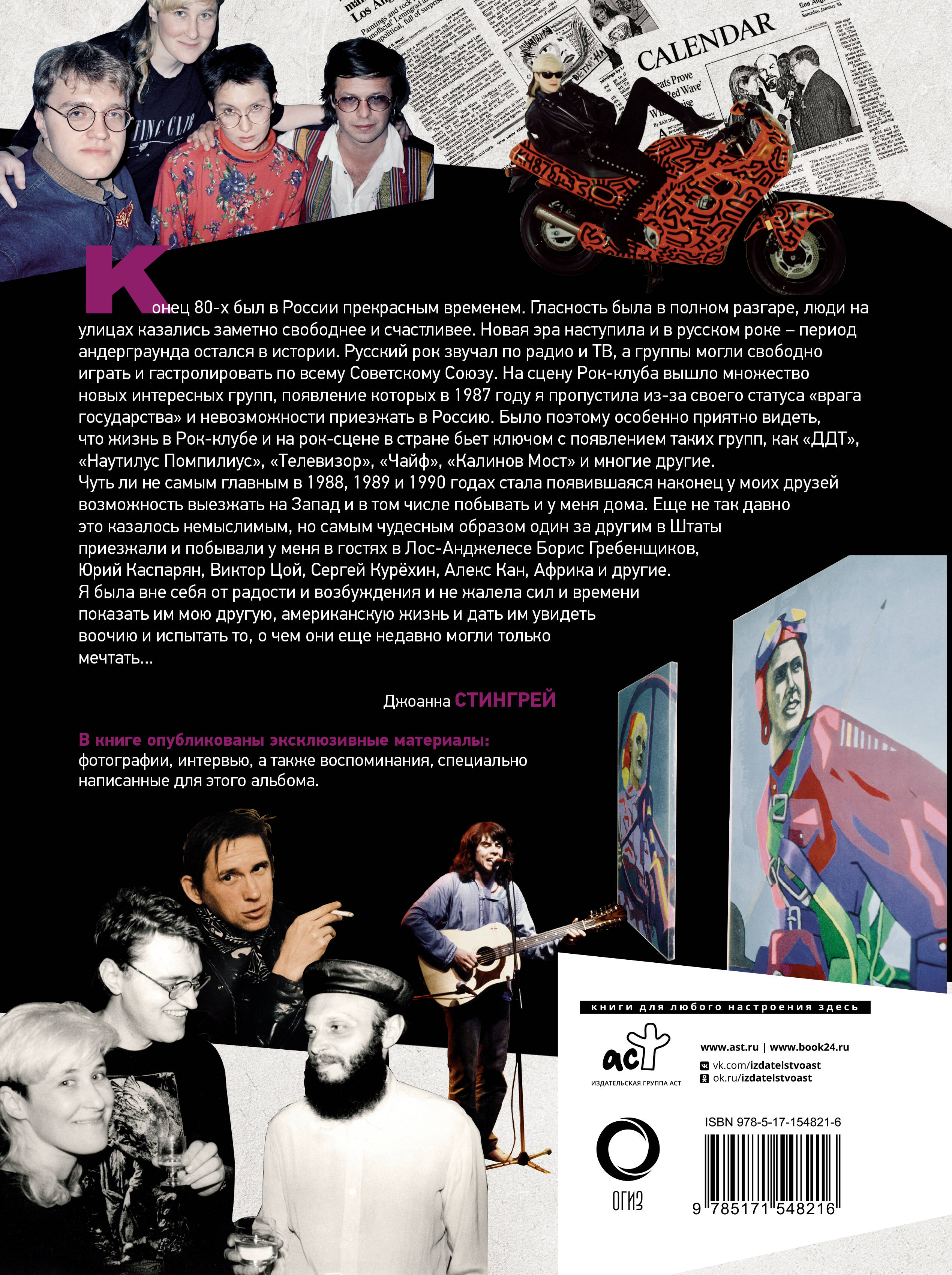 Джоанна Стингрей - американская певица, музыкальный продюсер и общественный деятель, одна из значимых персон и популяризаторов советской и постсоветской рок-культуры на Западе. Джоанны Стингрей о новом альбоме "Русский рок. Новая Эра": "Конец 80-х был в России прекрасным временем. Гласность была в полном разгаре, люди на улицах казались заметно свободнее и счастливее. Новая эра наступила и в русском роке - период андерграунда остался в истории... На сцену Рок-клуба вышло множество новых интересных групп, появление которых в 1987 году я пропустила из-за своего статуса "врага государства" и невозможности приезжать в Россию. Было поэтому особенно приятно видеть, что жизнь в Рок-клубе и на рок-сцене в стране бьет ключом с появлением таких групп, как "ДДТ", "Наутилус Помпилиус", "Телевизор", "Чайф", "Калинов Мост" и многих других..." В книге опубликованы эсклюзивные материалы: фотографии, интервью, а также воспоминания участников событий того времени, специально написанные для этого альбома.| Издательство | ИЗДАТЕЛЬСТВО "АСТ" |