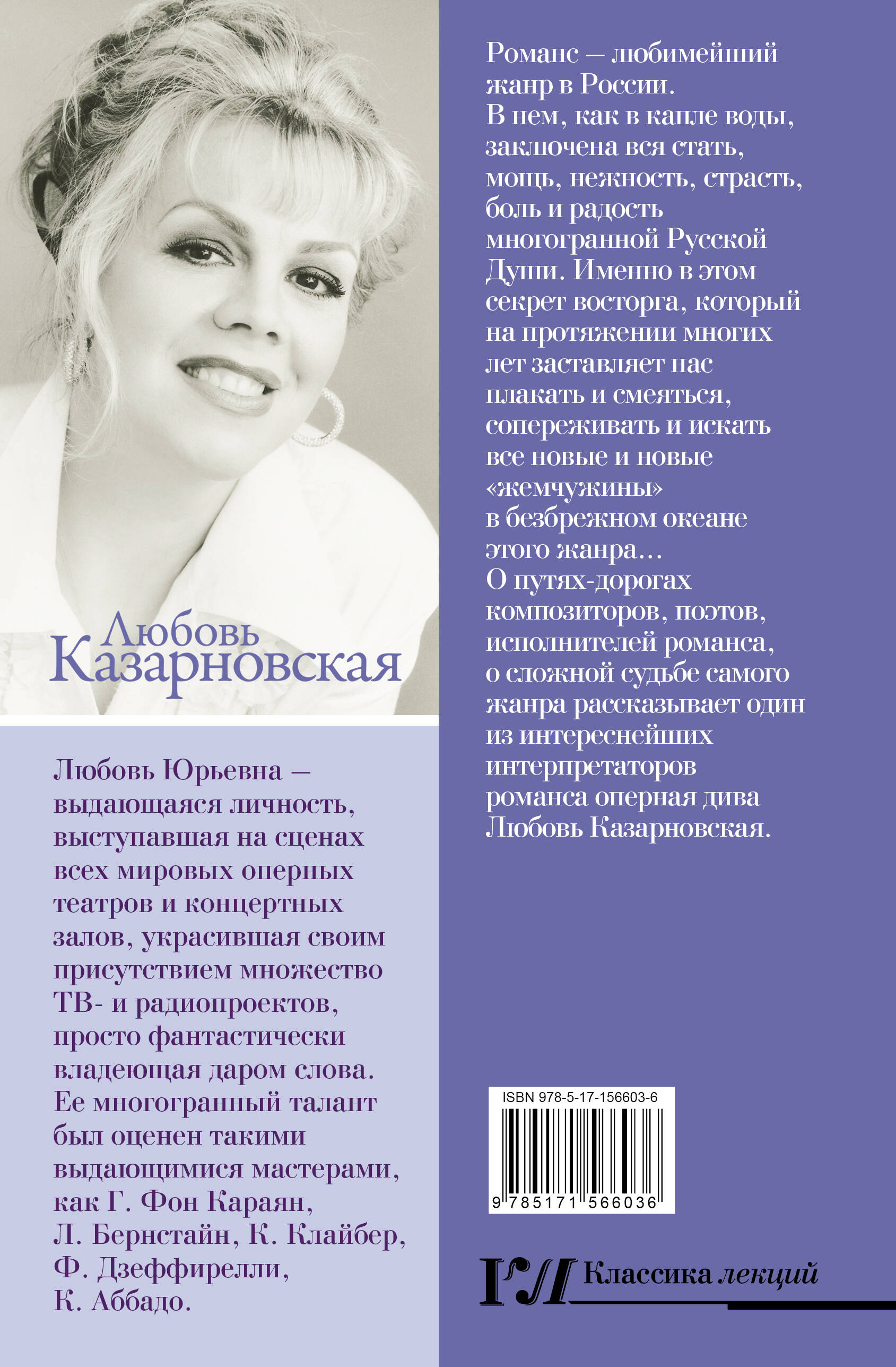 Романс - любимейший жанр в России. В нем как в капле воды заключена вся стать, мощь, нежность, страсть, боль и радость многогранной Русской Души. Именно в этом секрет восторга, который на протяжении многих лет заставляет нас плакать и смеяться, сопереживать и искать все новые и новые "жемчужины" в безбрежном океане этого жанра... О путях-дорогах композиторов, поэтов, исполнителей романса, о сложной судьбе самого жанра рассказывает один из интереснейших интерпретаторов романса, оперная дива Любовь Казарновская.| Издательство | ИЗДАТЕЛЬСТВО "АСТ" |