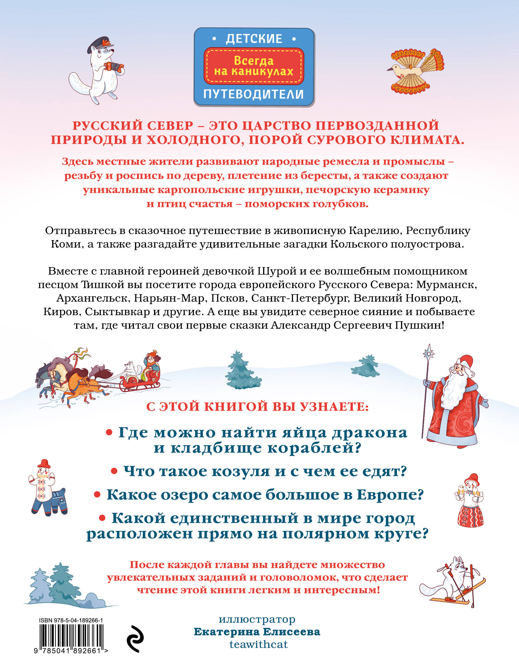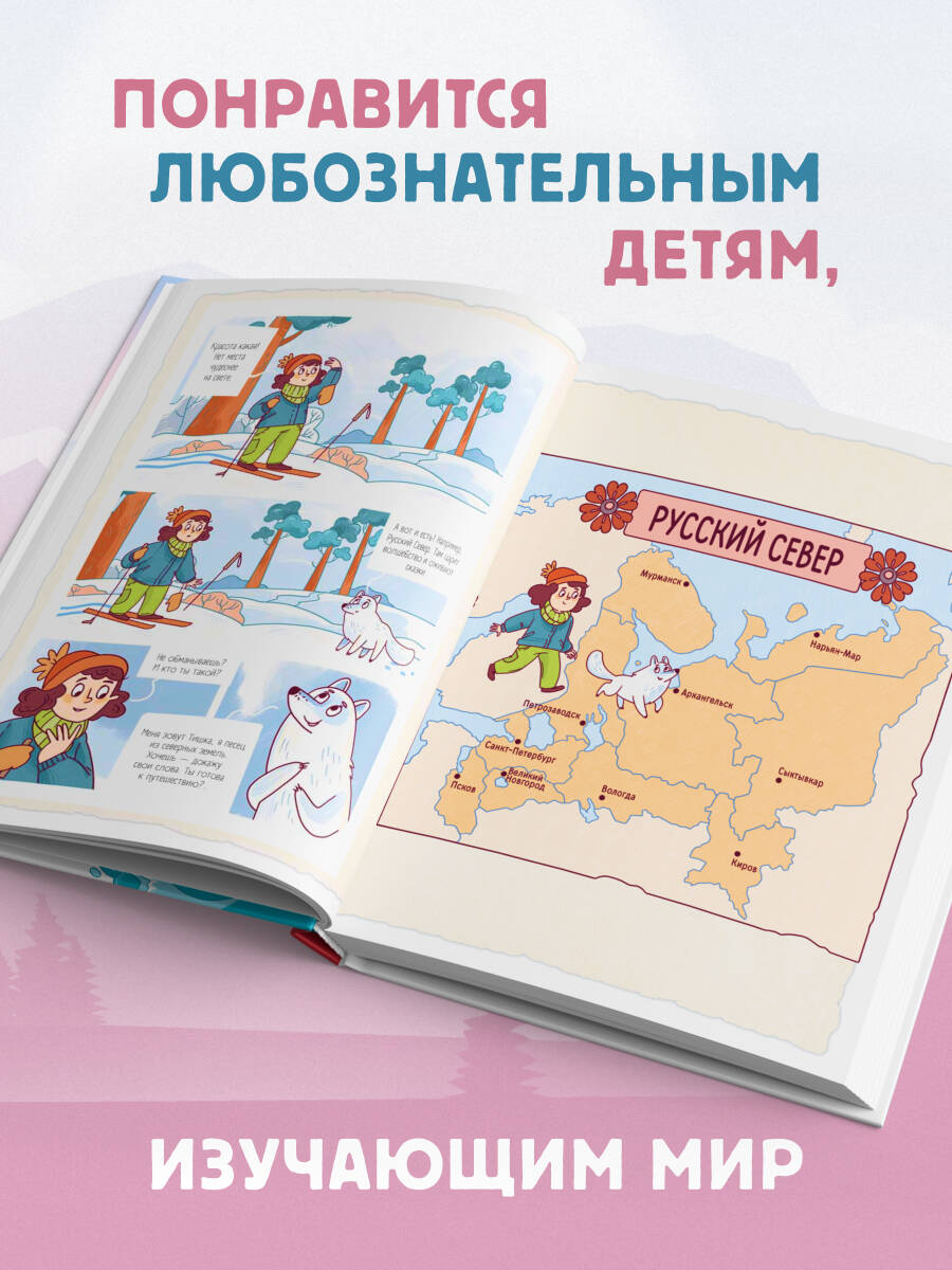 «Русский север для детей» - увлекательная детская книга о путешествии в северные регионы Европейской части России. Вместе с героями - любознательной Шурой и песцом Тишкой - вы отправитесь на поиски приключений! Познакомитесь с настоящим Дедом Морозом и погуляете по его владениям, разгадаете загадки Кольского полуострова, отправитесь в Республику Коми и в живописную Карелию. На страницах путеводителя можно найти красочные портреты, достопримечательности и предметы народных промыслов. А яркие фотографии отлично дополняют повествование. В книге можно найти множество увлекательных заданий и головоломок. Решение кроссвордов, задачек, загадок и ребусов помогает маленьким читателям увлечься процессом и запомнить намного больше информации. Отправляйтесь в самое интересное путешествие на Русский Север вместе с «Детским путеводителем»! Книга написана доступным для ребенка языком, сообщает множество увлекательных и важных фактов. Издание выполнено с учетом всех санитарно-технических требований и абсолютно безопасно для детей.| Издательство | ООО "Издательство "Эксмо" |